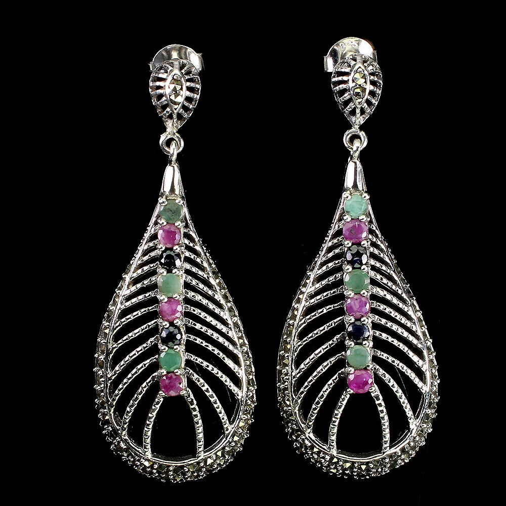 Wir bieten Ihnen neue Ohrringe aus 925er Silber mit natürlichen Smaragden, Rubinen, blauen Saphiren und Markasiten.