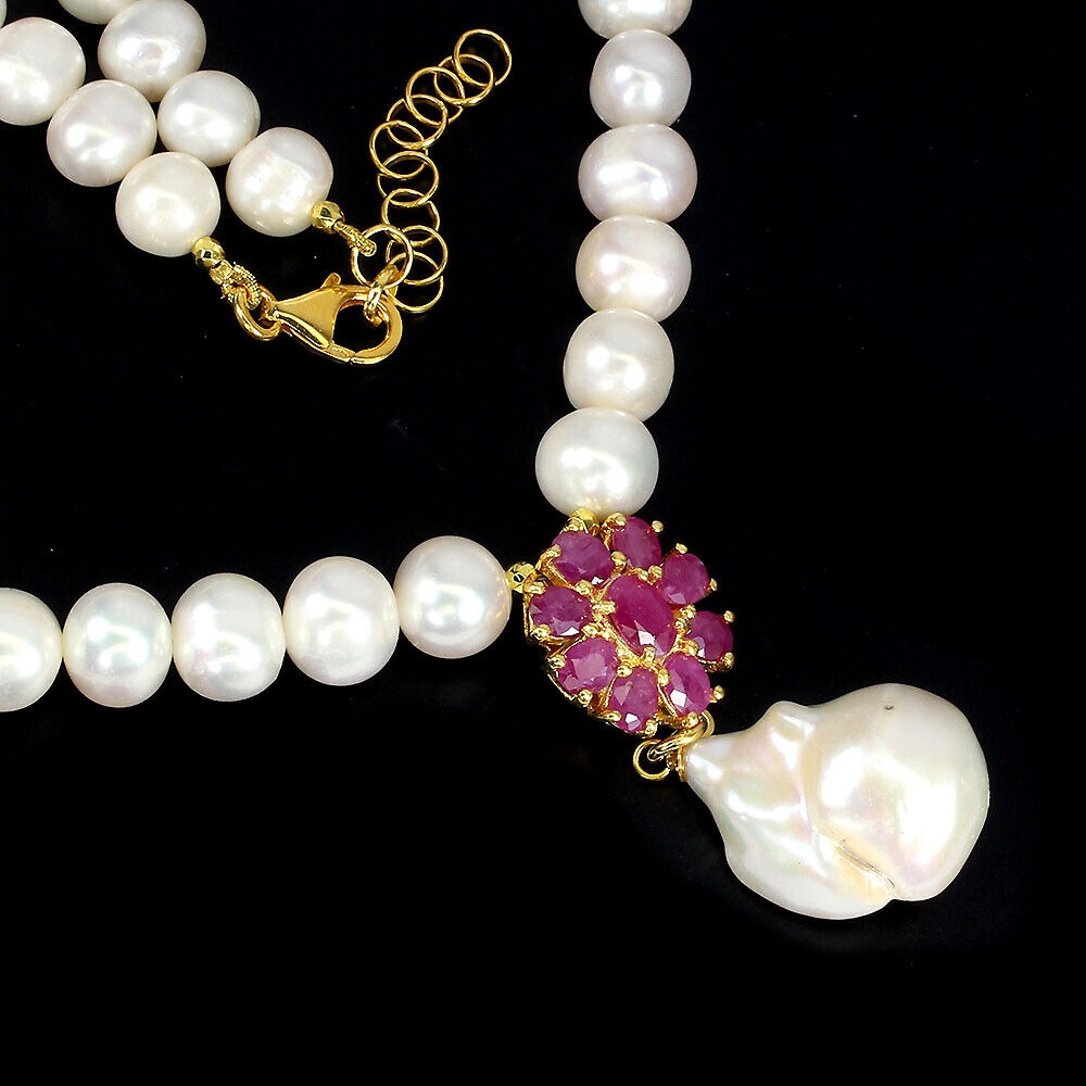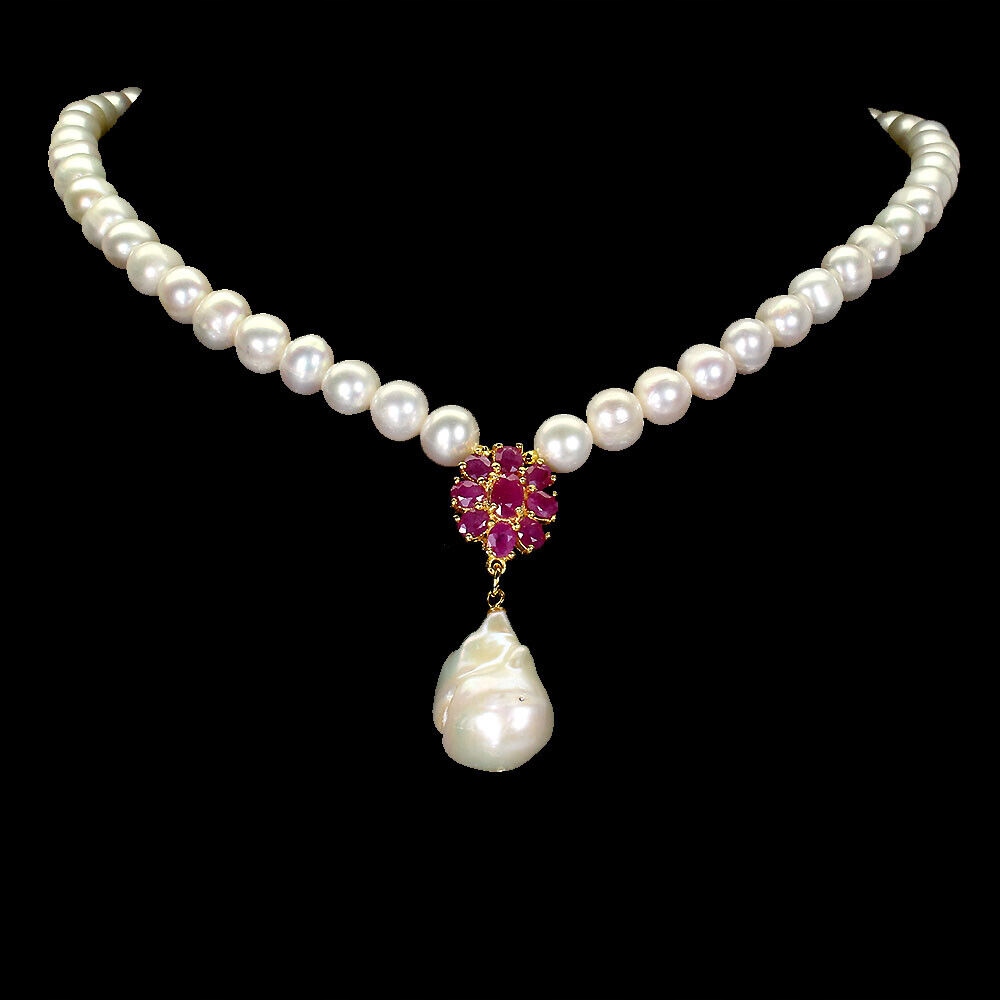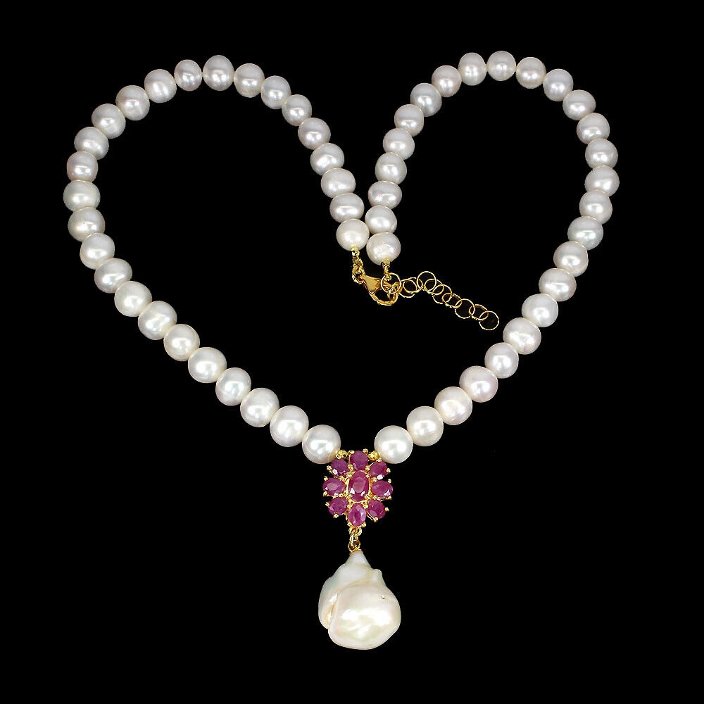 Wir bieten Ihnen eine neue, 14 Karat Gelbgold, Silber - 925 Feinheit Halskette mit natürlichen Perlen und Rubinen.