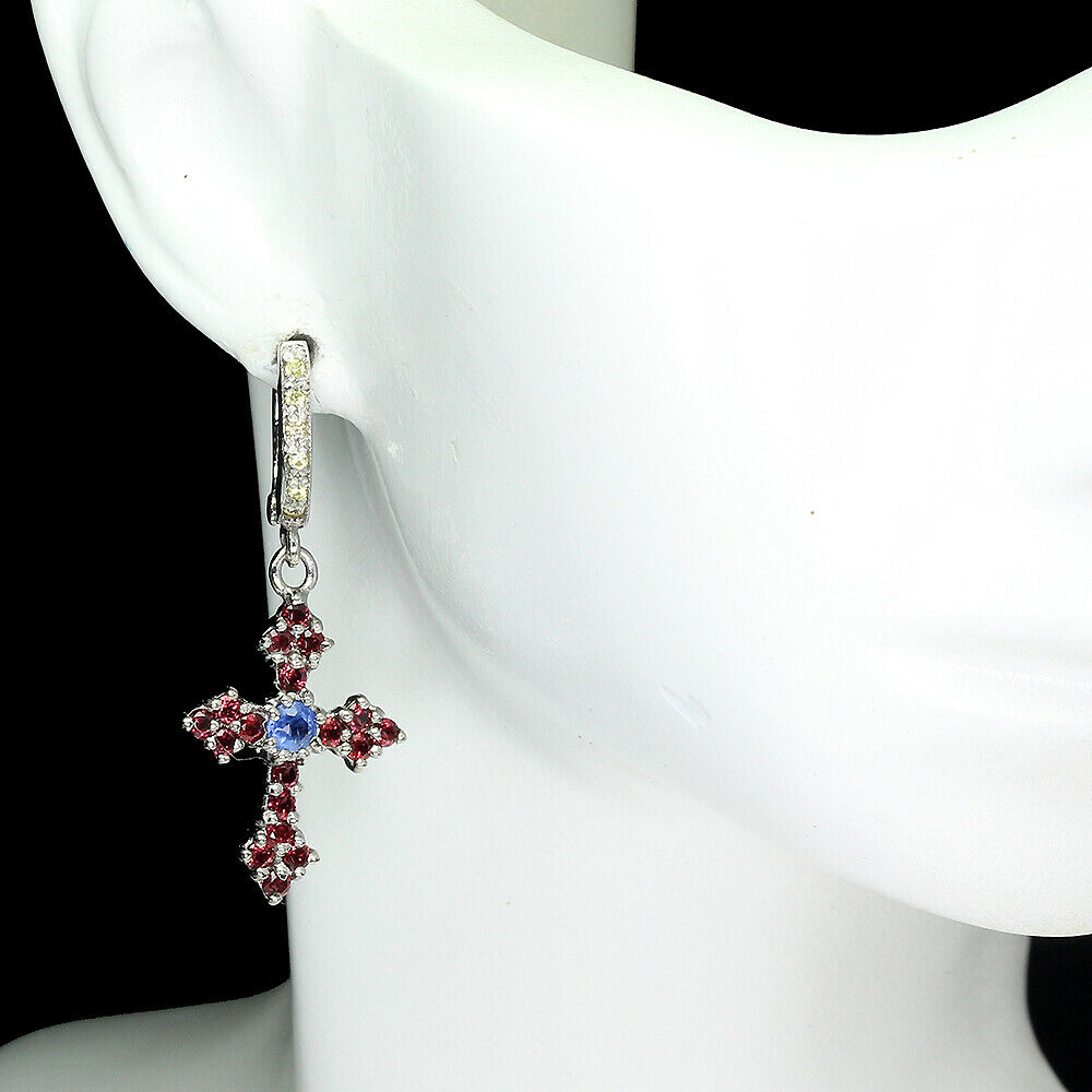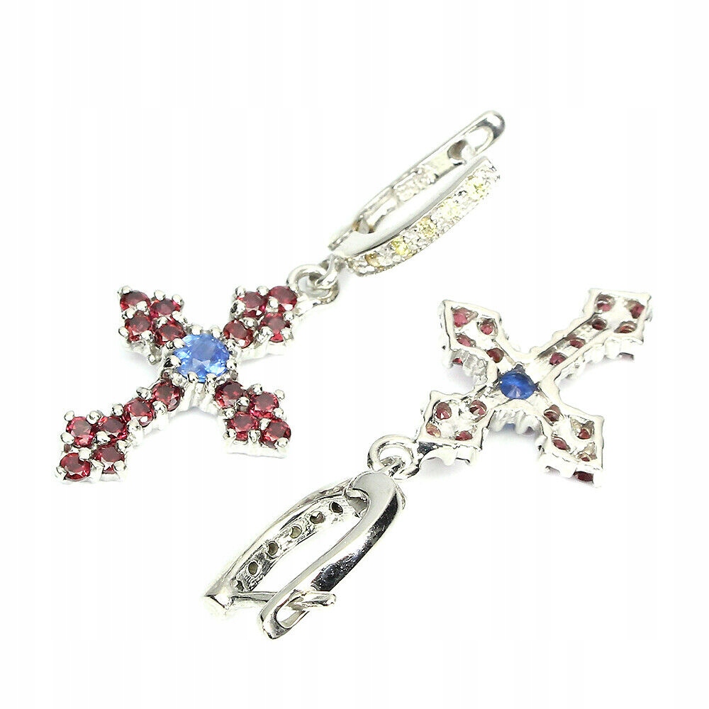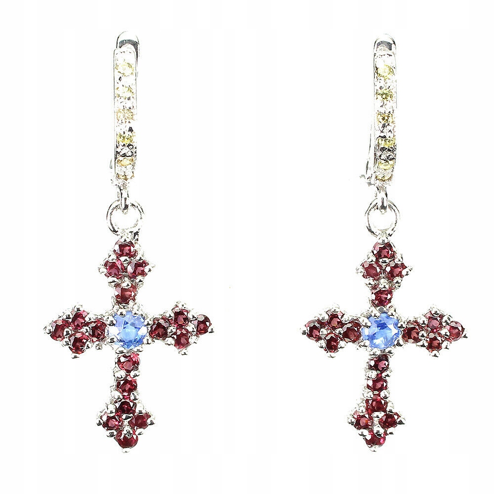Wir bieten Ihnen neue, 14 Karat weiß vergoldete, Silber - 925, Ohrringe mit natürlichen Saphiren, Tansaniten und Granaten (Rhodoliten). Schönes Kreuz.
