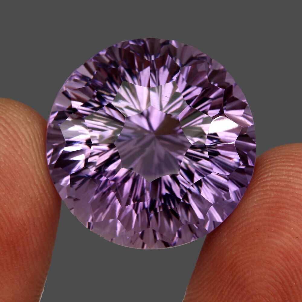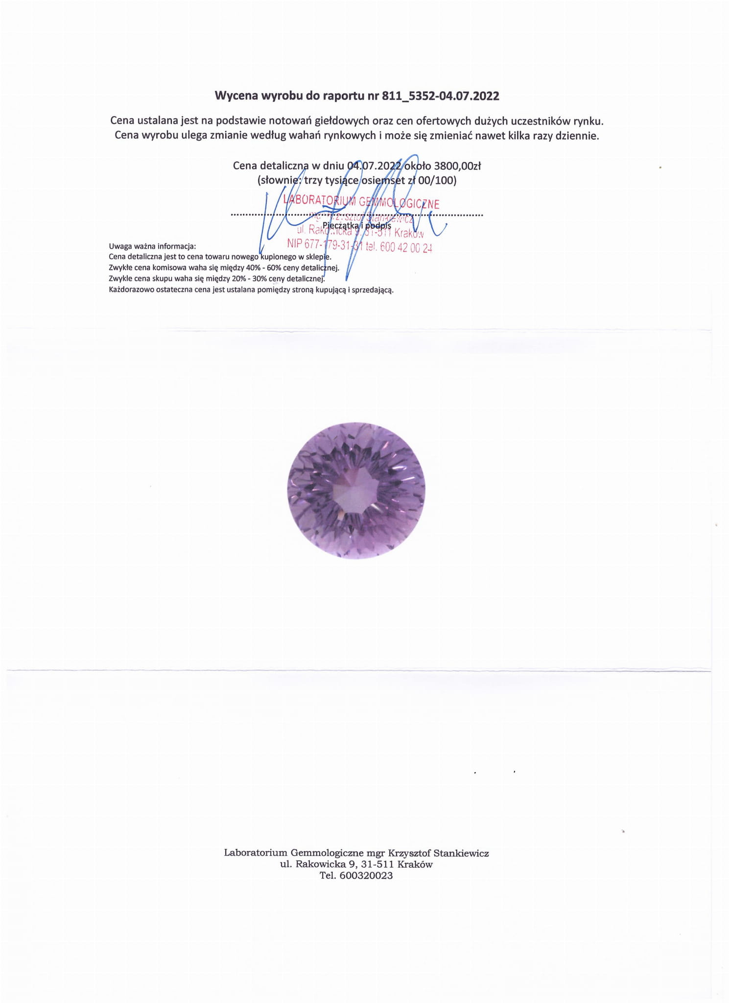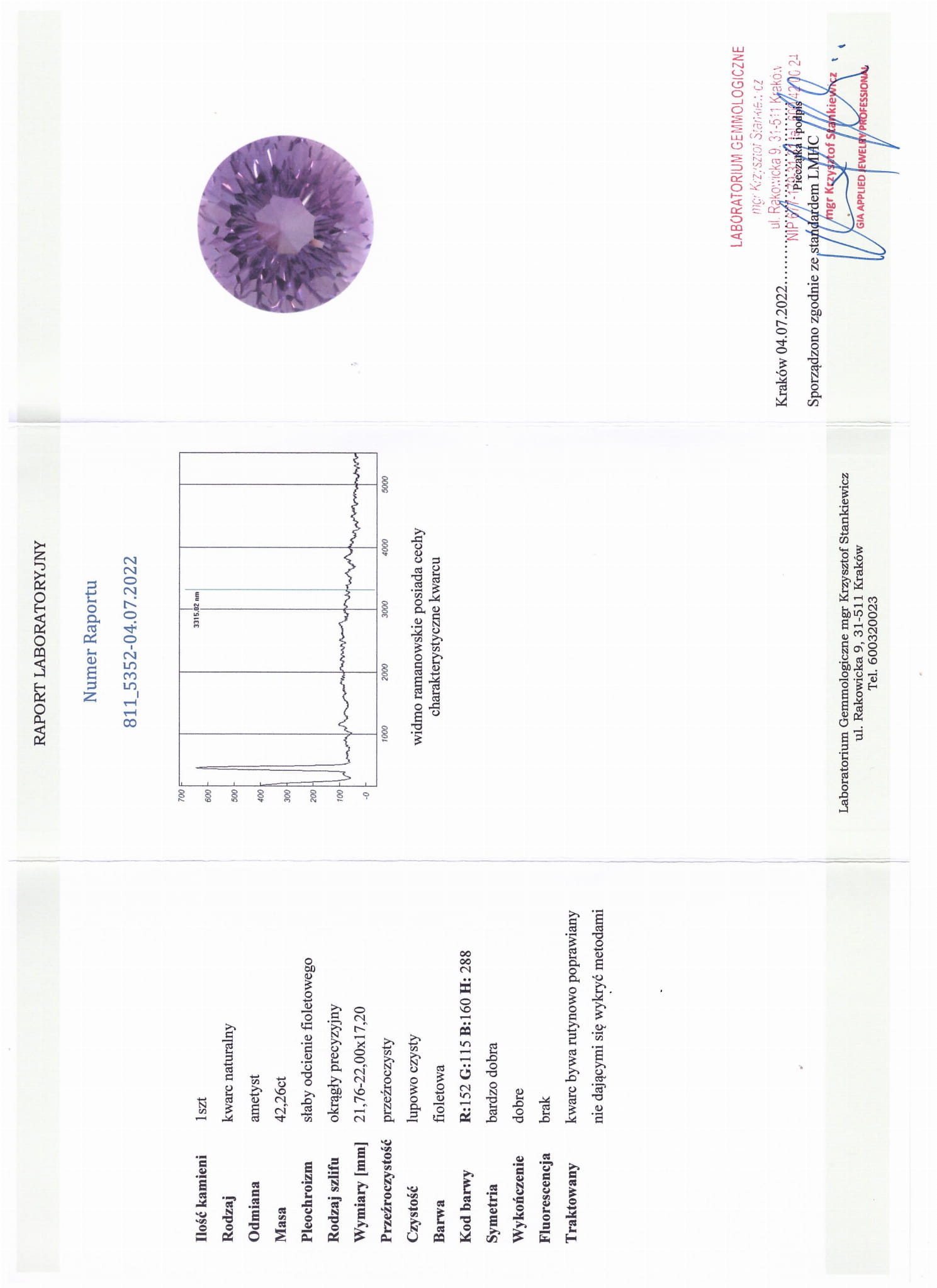 Schliff: präzise rund, Reinheit: Lupe, Farbe: violett, Symmetrie: sehr gut, Verarbeitung: gut. Die Parameter des Steins sind im Laborbericht dargestellt, der auf dem beigefügten Foto sichtbar ist.