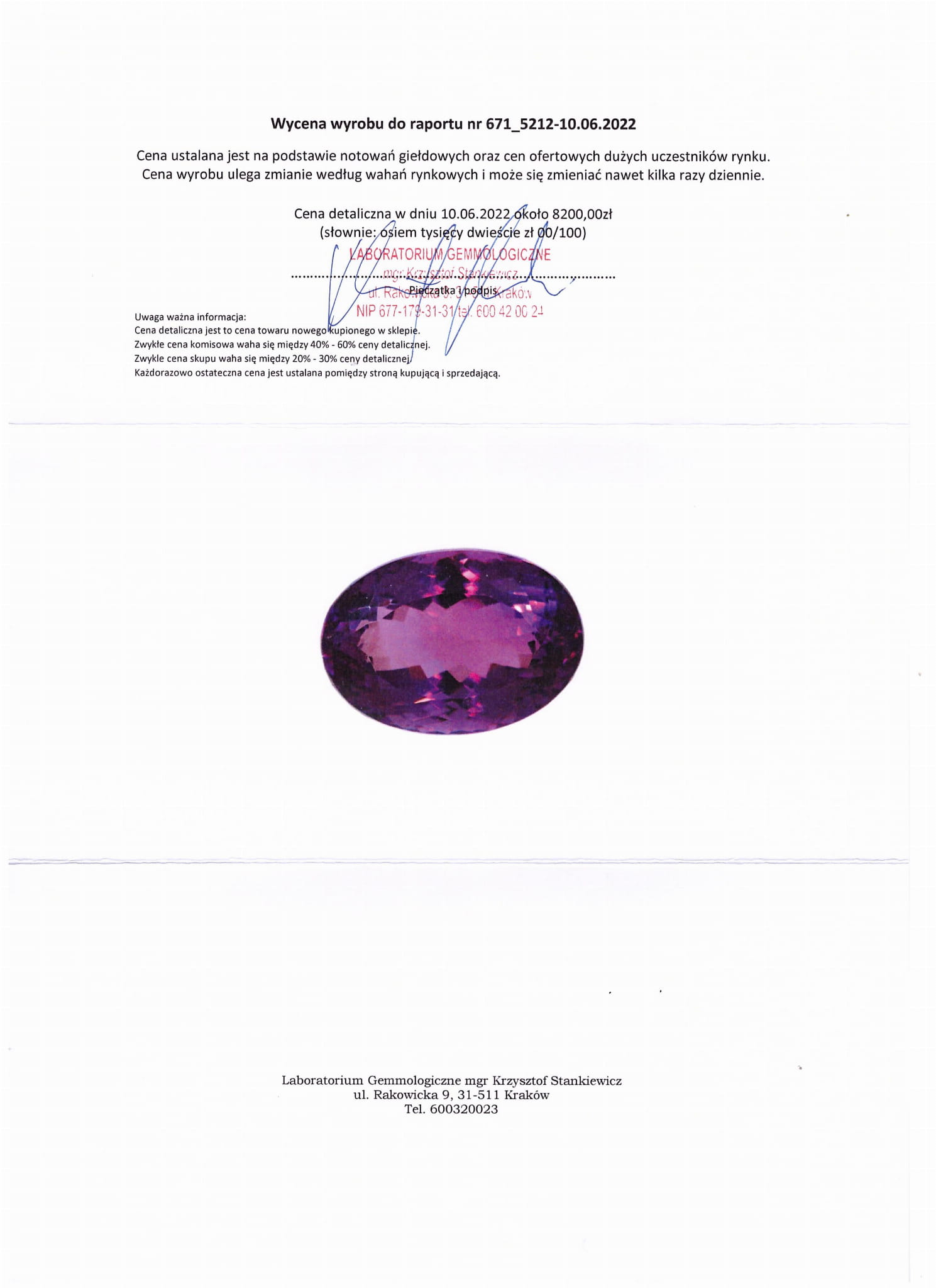 Amethyst Naturstein 53,75 ct. Der Stein hat ein Zertifikat und eine Bewertung von 8.200 PLN.