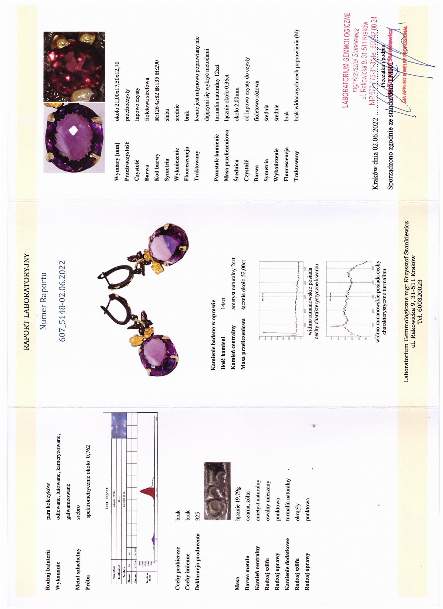 Anzahl Steine: 14 Stk. Mittelstein: Naturamethyst 2 Stk., ca. 52ct. Andere Steine: natürliche Turmaline 12 Stück, ca. 0,36 ct. Die genauen Parameter der Steine sind im Laborbericht dargestellt - das auf dem Foto sichtbare Zertifikat.