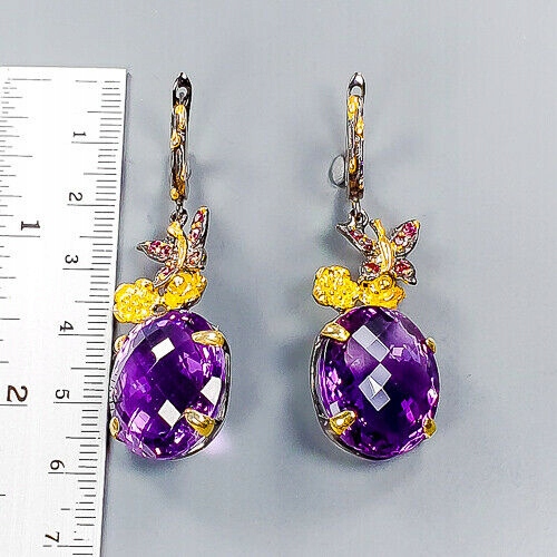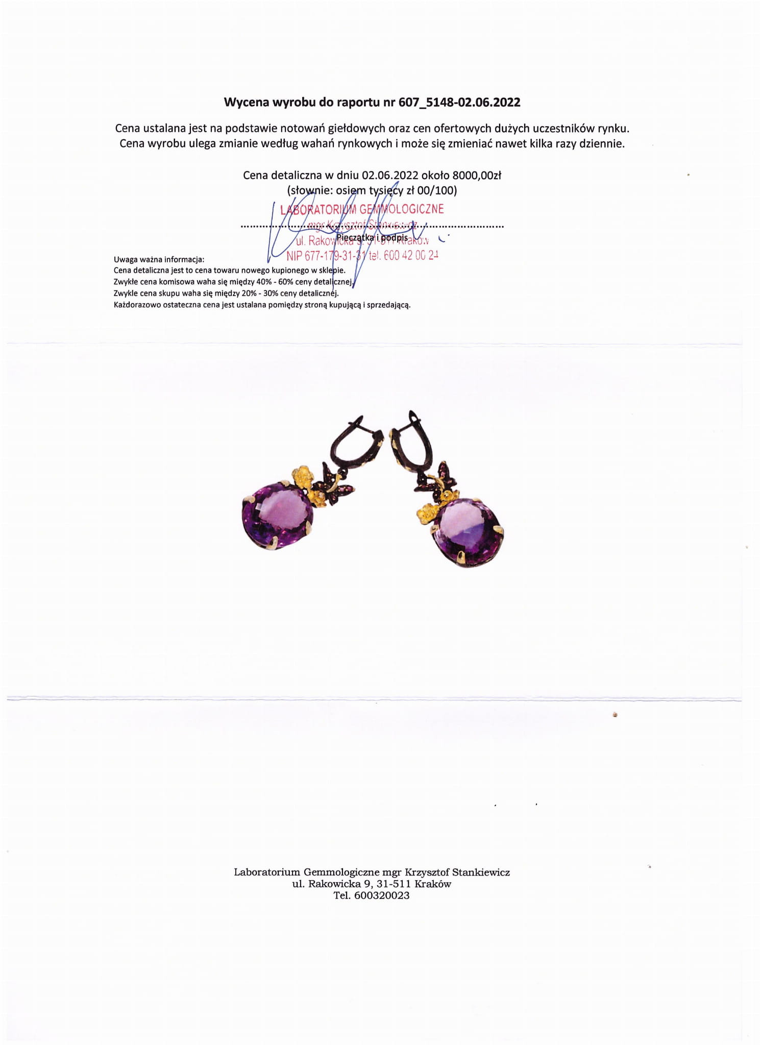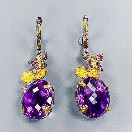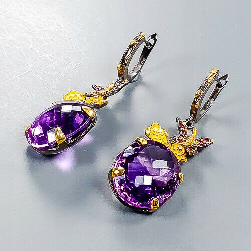wir bieten Ihnen neue, mit Gelbgold vergoldete und schwarz rhodinierte Silber - Feinheit 925 (spektrometrisch ca. 0,762) Ohrringe mit natürlichen, großen ca. 52ct Amethysten und natürlichen Turmalinen. Sie haben ein Zertifikat und eine Schätzung von 8.000 PLN.