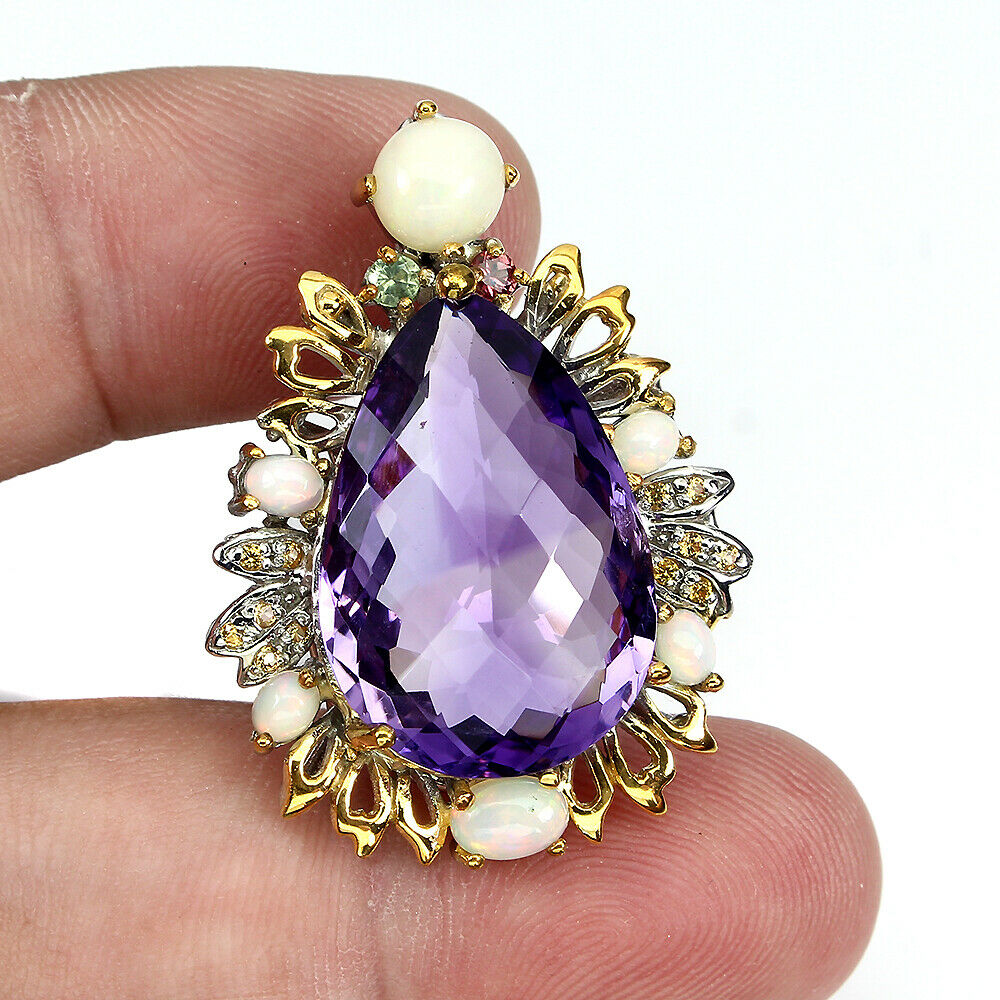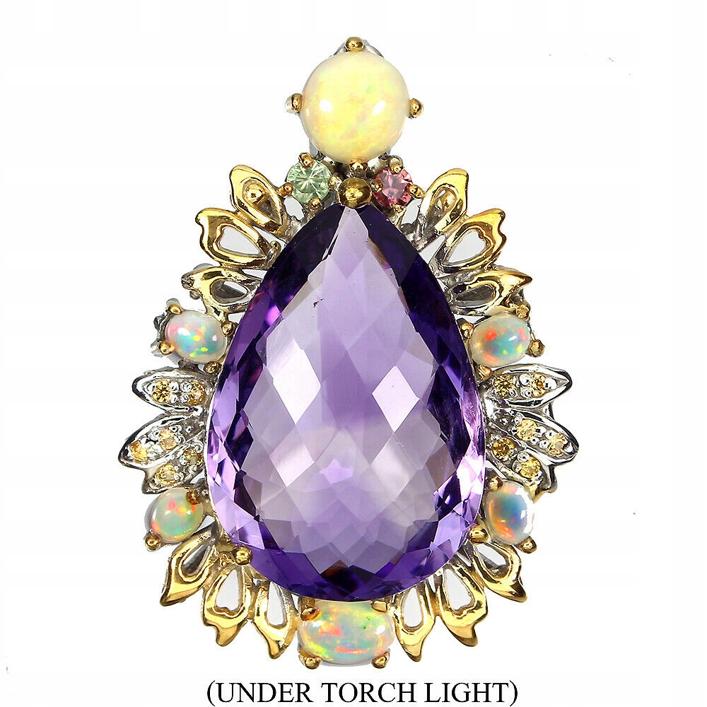 Wir bieten Ihnen einen neuen, Silber - 925 - vergoldeten 14 Karat Gelb- und Weißgold-Anhänger mit natürlichem 21,42 ct Amethyst, Feueropalen, Turmalinen und Songea Saphiren.
