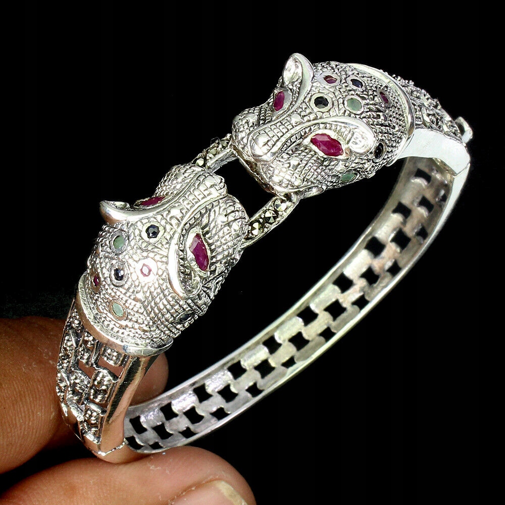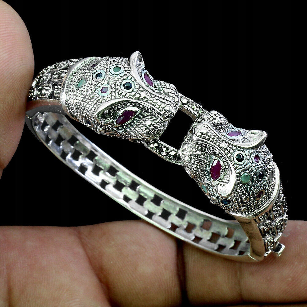 Wir bieten Ihnen ein neues Armband aus Silber - 925 mit natürlichen Rubinen, blauen Saphiren, Markasiten und Smaragden an. Schöne Tiger.