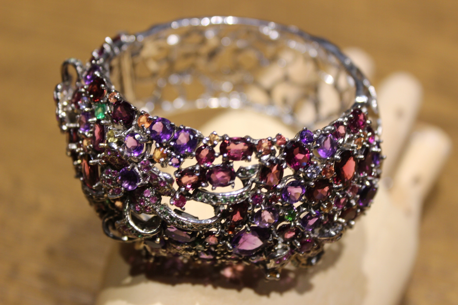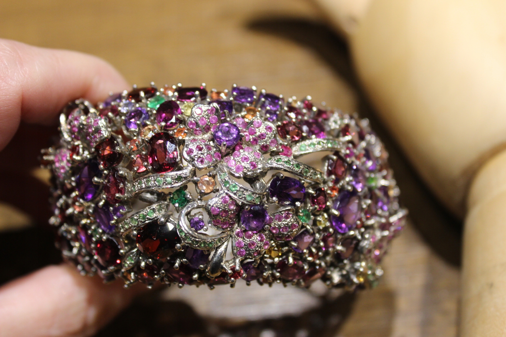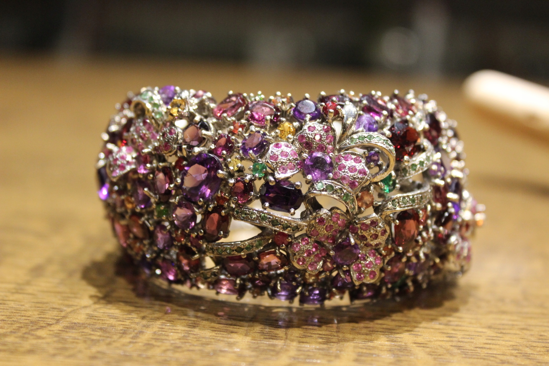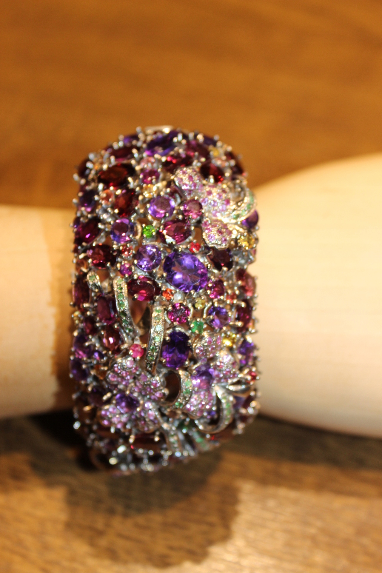 Das Armband ist wunderschön. Sie hat Blüten, Blätter, sie ist reich übersät mit z.B. Saphire in verschiedenen Farben, Tsavorite, Amethyste und Spessartine.
