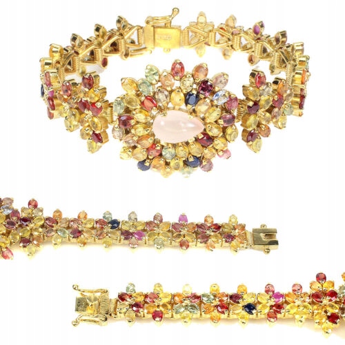 Wir bieten Ihnen ein neues, 14K gelbvergoldetes 925er Silberarmband mit natürlichen Songea-Saphiren und rosa Quarz an.