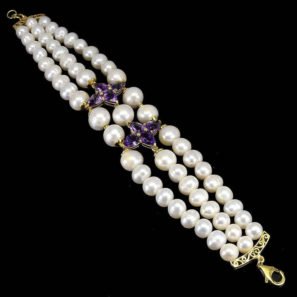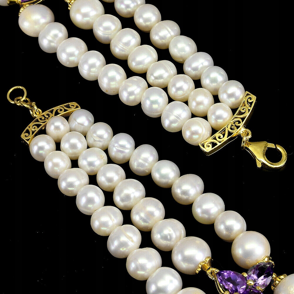 Wir bieten Ihnen ein neues Armband aus 14 Karat Gelbgold, Silber - 925 mit natürlichen Amethysten und Perlen an.