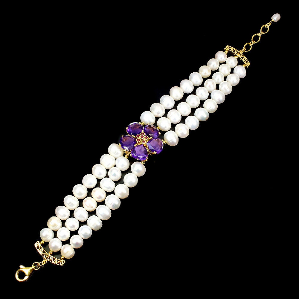 Wir bieten Ihnen ein neues Armband aus 14 Karat Gelbgold, Silber - 925 mit natürlichen Amethysten, Rubinen und Perlen an.