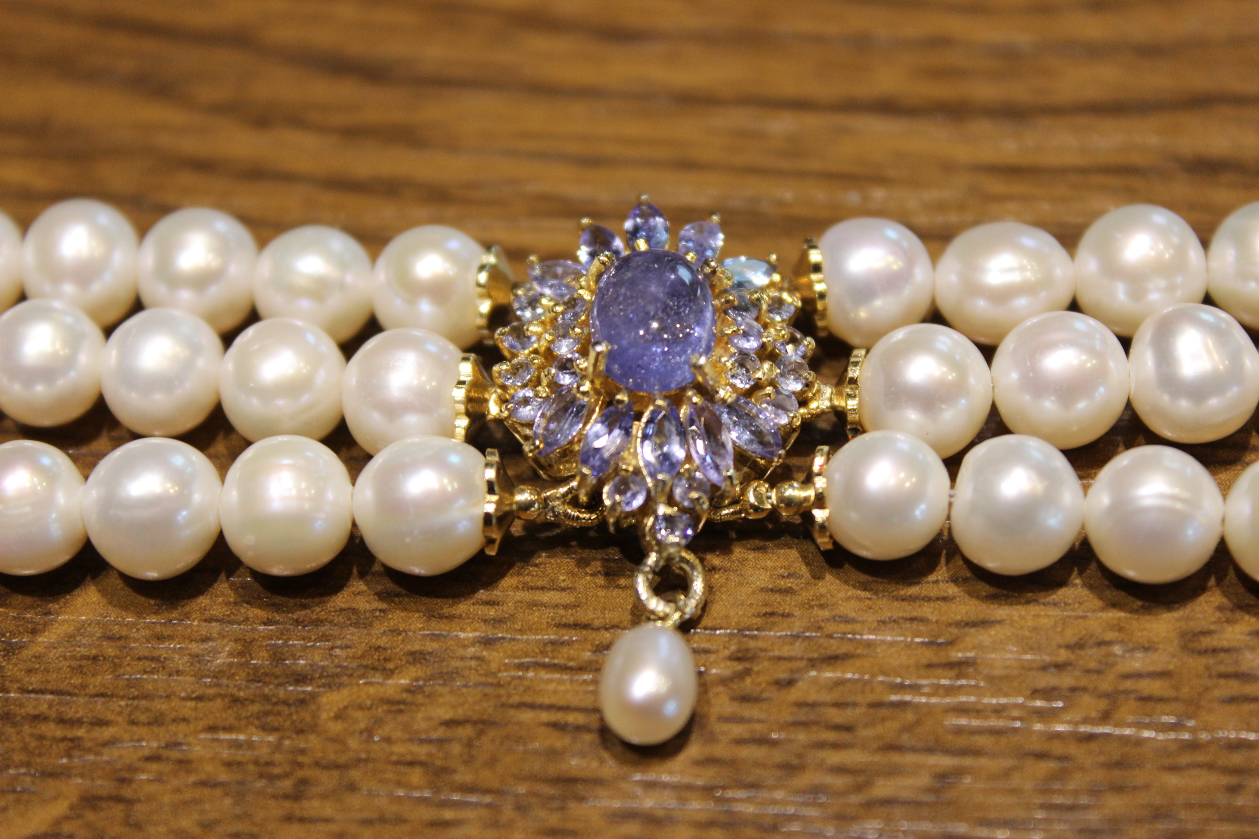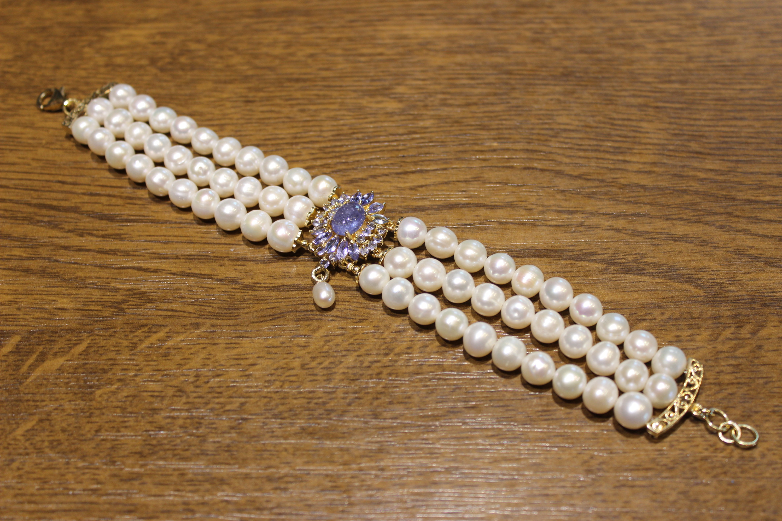 Wir bieten Ihnen ein neues Armband aus 14 Karat Gelbgold, Silber - 925 mit Naturperlen und Tansaniten an.
