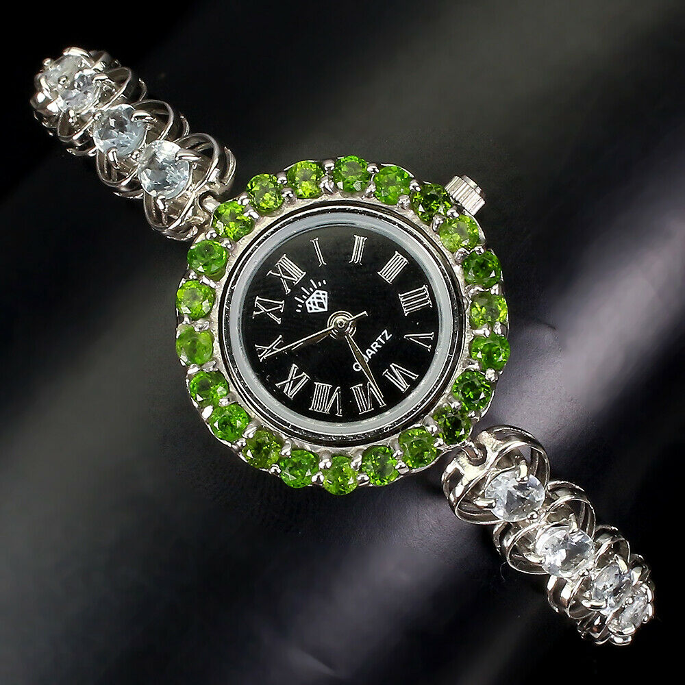 Wir bieten Ihnen eine neue, vergoldete 14 Karat Weißgold, Silber - 925 Armbanduhr mit natürlichen Diopsiden und Aquamarinen an.