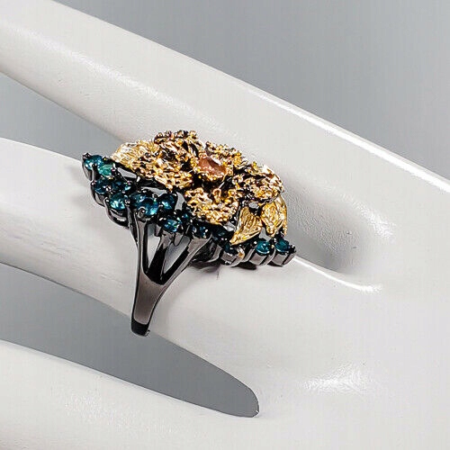 Wir bieten Ihnen einen neuen, gelbgoldenen und schwarzrhodinierten Silber-925-Ring mit natürlichem Turmalin und Zirkonia an.