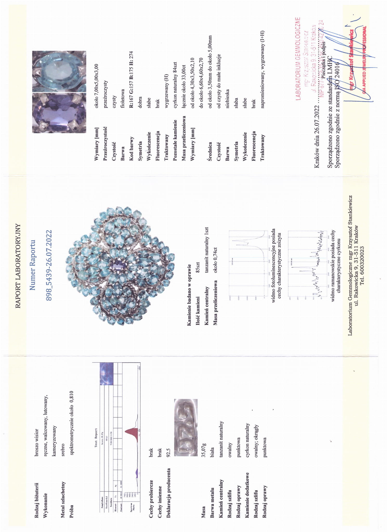 Ich biete eine neue, weißvergoldete, Silber - 925 (spektrometrisch ca. 0,810) Anhänger-Brosche mit natürlichen Zirkonen und natürlichem Tansanit zum Verkauf an. Es ist handgefertigt, gerollt, gelötet und kamerabeschichtet. Es hat ein Zertifikat und eine Schätzung für 6.100 PLN.