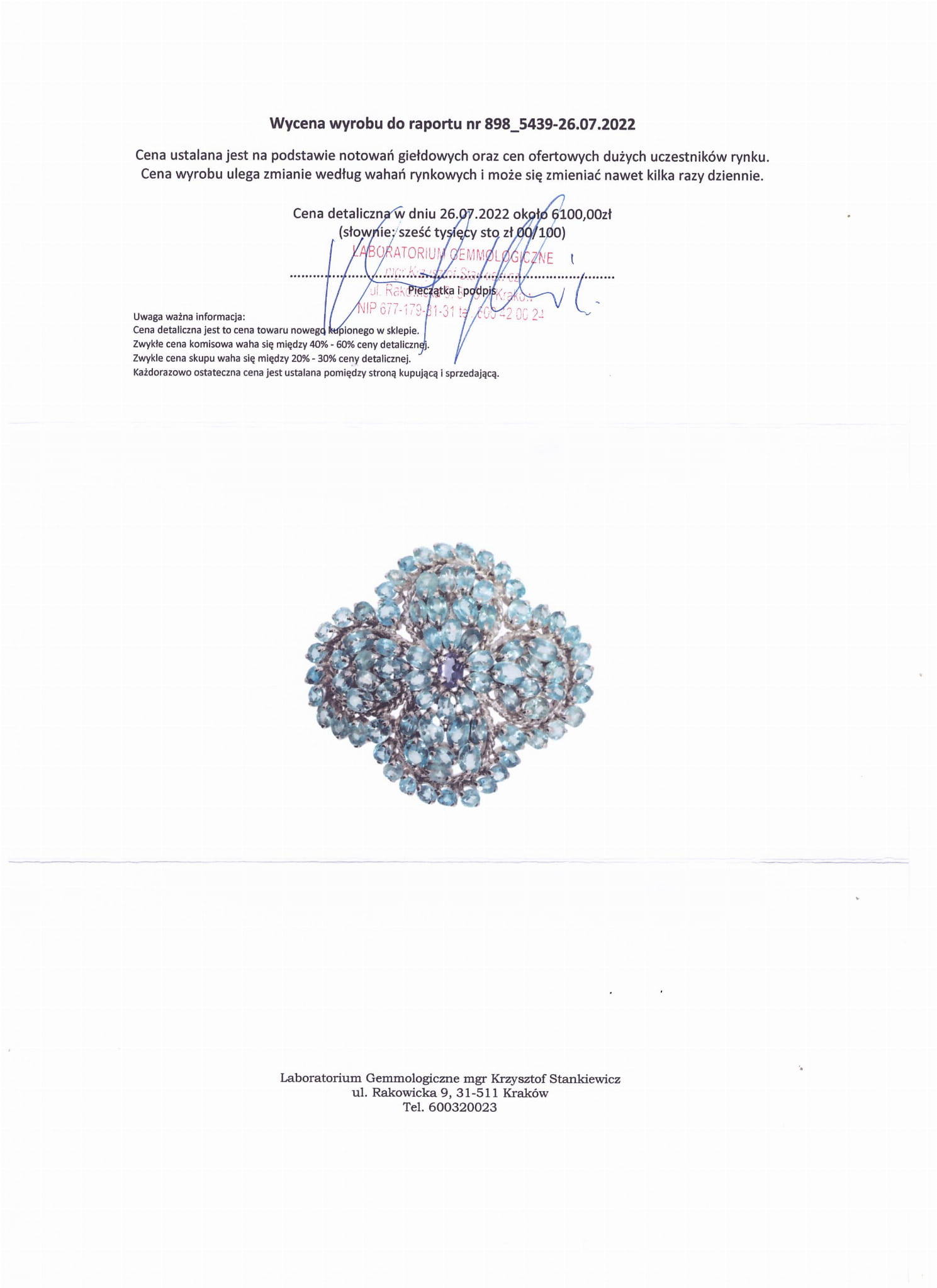 Anzahl Steine: 85 Stk. Mittelstein: natürlicher Tansanit 1 Stk., ca. 0,74 ct. Sonstige Steine: natürlicher Zirkon: 84 Stk., ca. 33ct. Die genauen Parameter der Steine sind im Laborbericht dargestellt - das auf dem Foto sichtbare Zertifikat.