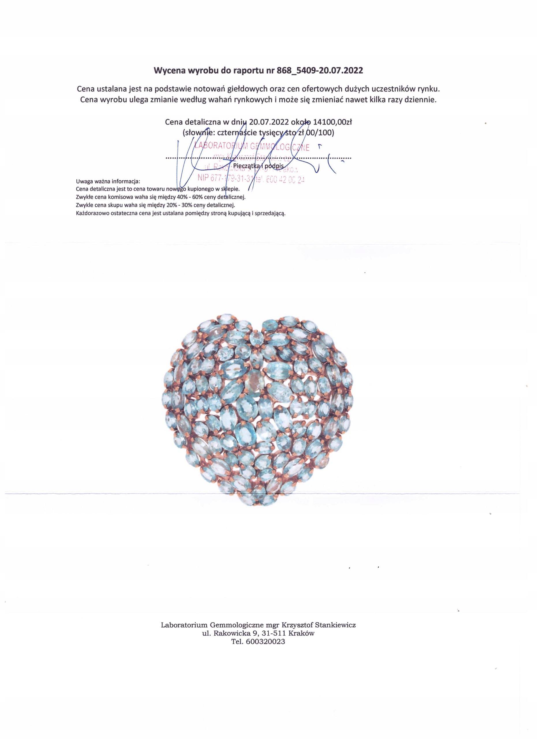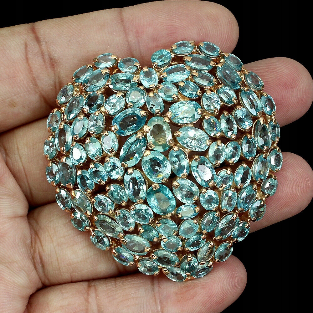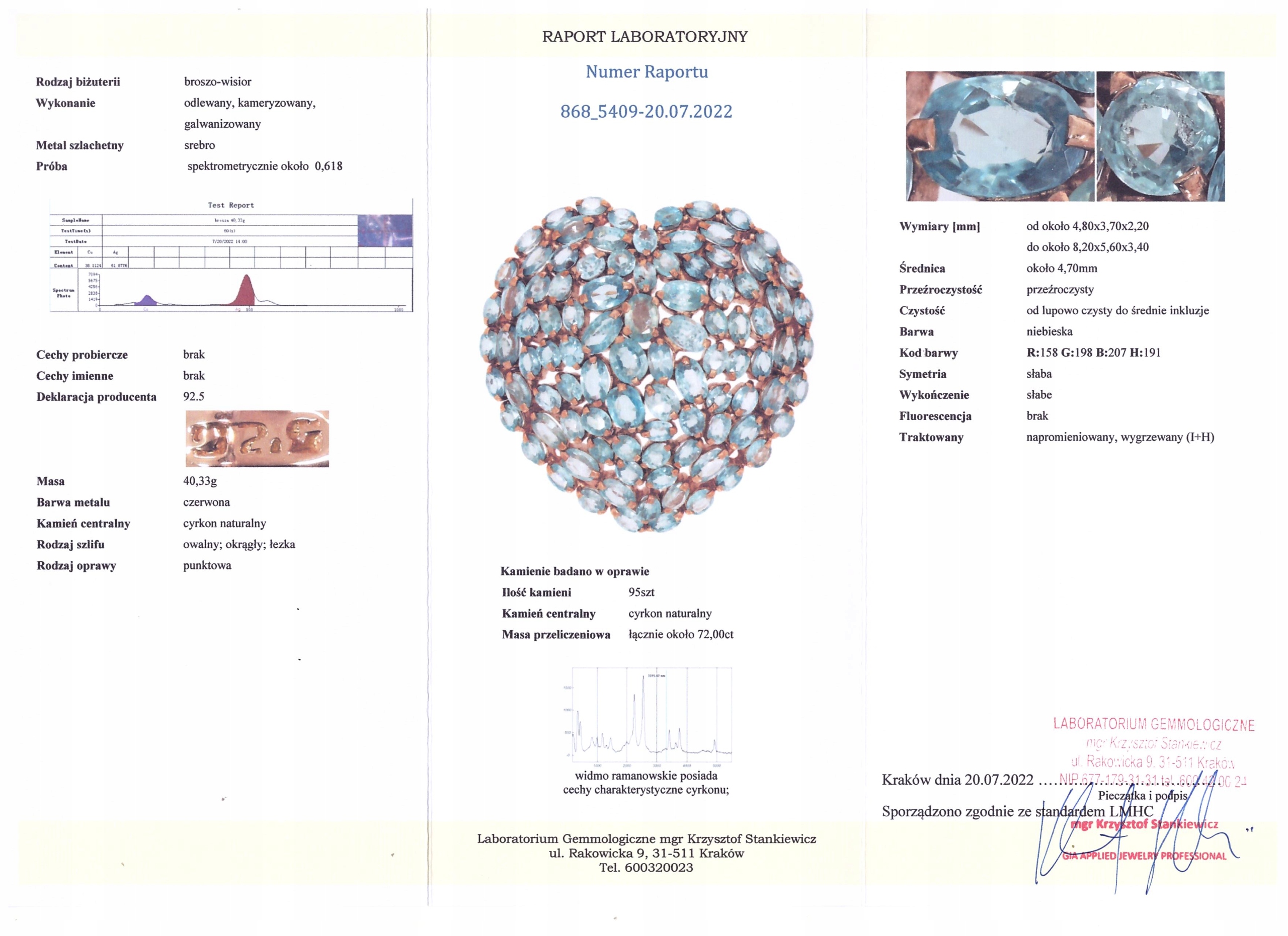 Ich verkaufe eine neue, 14K vergoldete (rote Farbe), Silber - Feinheit 925 (spektrometrisch ca. 0,618) Anhänger-Brosche mit natürlichen Zirkonen. Es hat ein Zertifikat und eine Schätzung für 14.100 PLN. Es ist gegossen, kameraisiert, verzinkt.