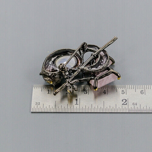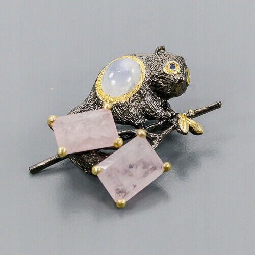 Wir bieten Ihnen eine neue vergoldete Brosche aus Gelbgold und schwarz rhodiniertem Silber - 925 mit natürlichen Morganiten, Mondstein und Saphiren.
