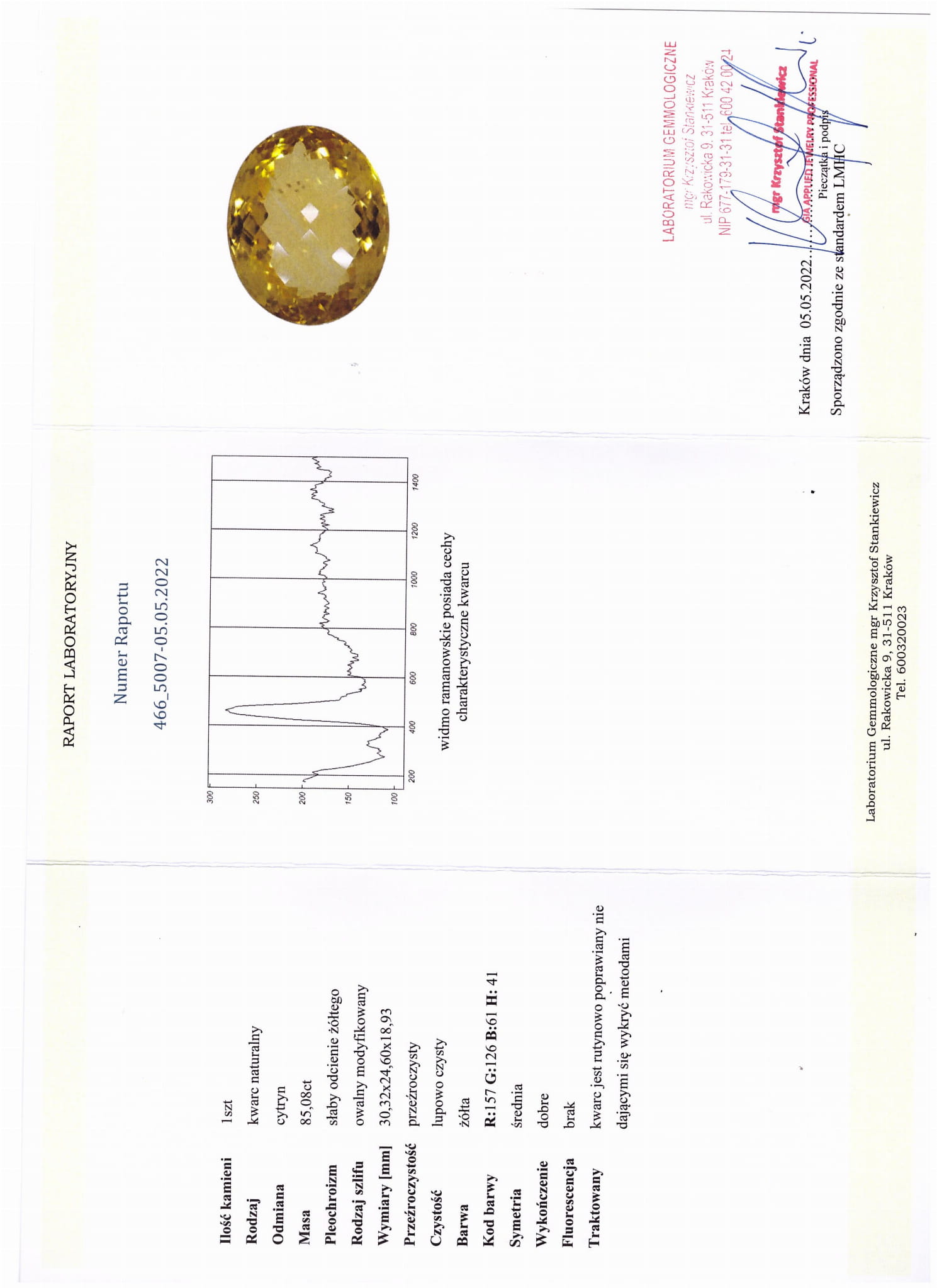 Der Stein hat ein Zertifikat mit einer detaillierten Beschreibung seiner Parameter und einem Wert von 6.400 PLN.