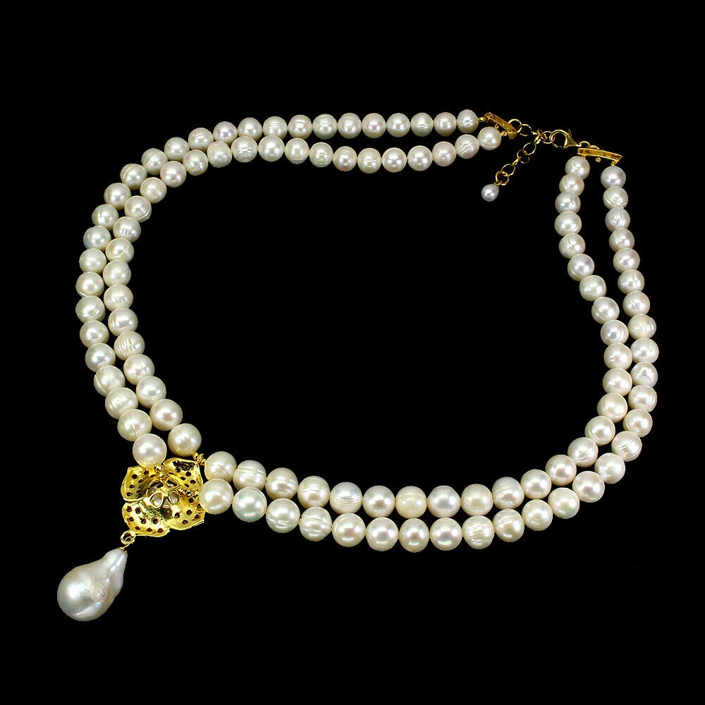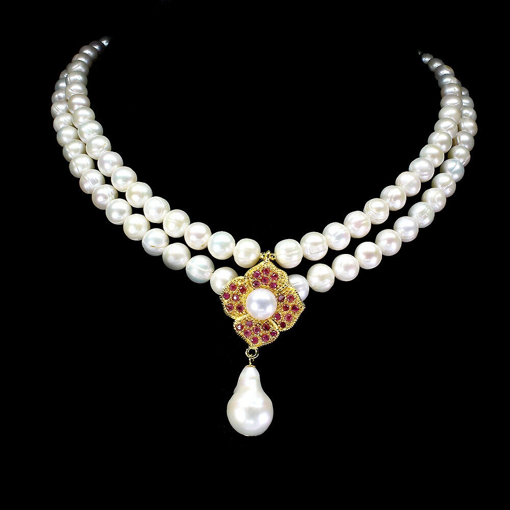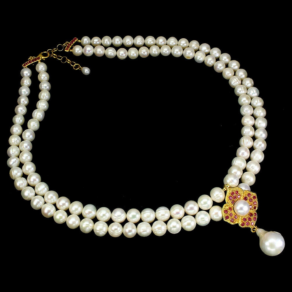14 Karat gelbvergoldete Silber - 925er Silberkette mit Naturperlen und Rubinen an.