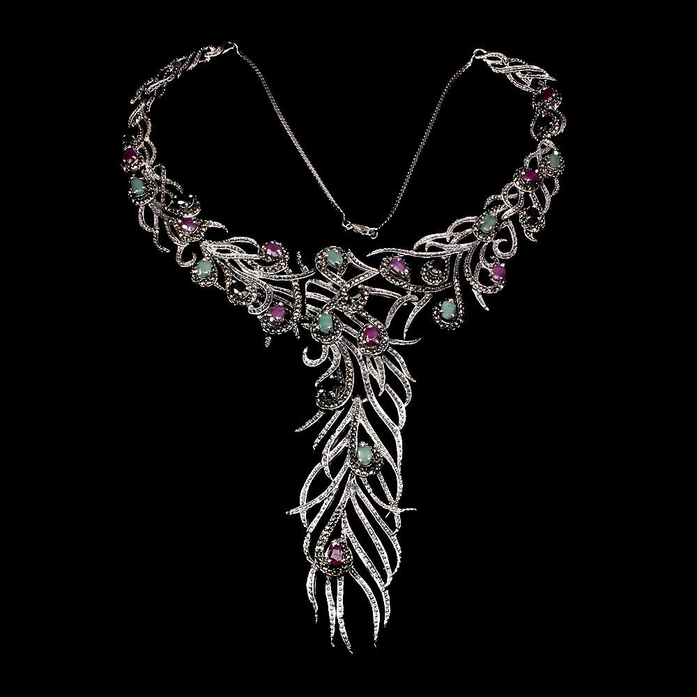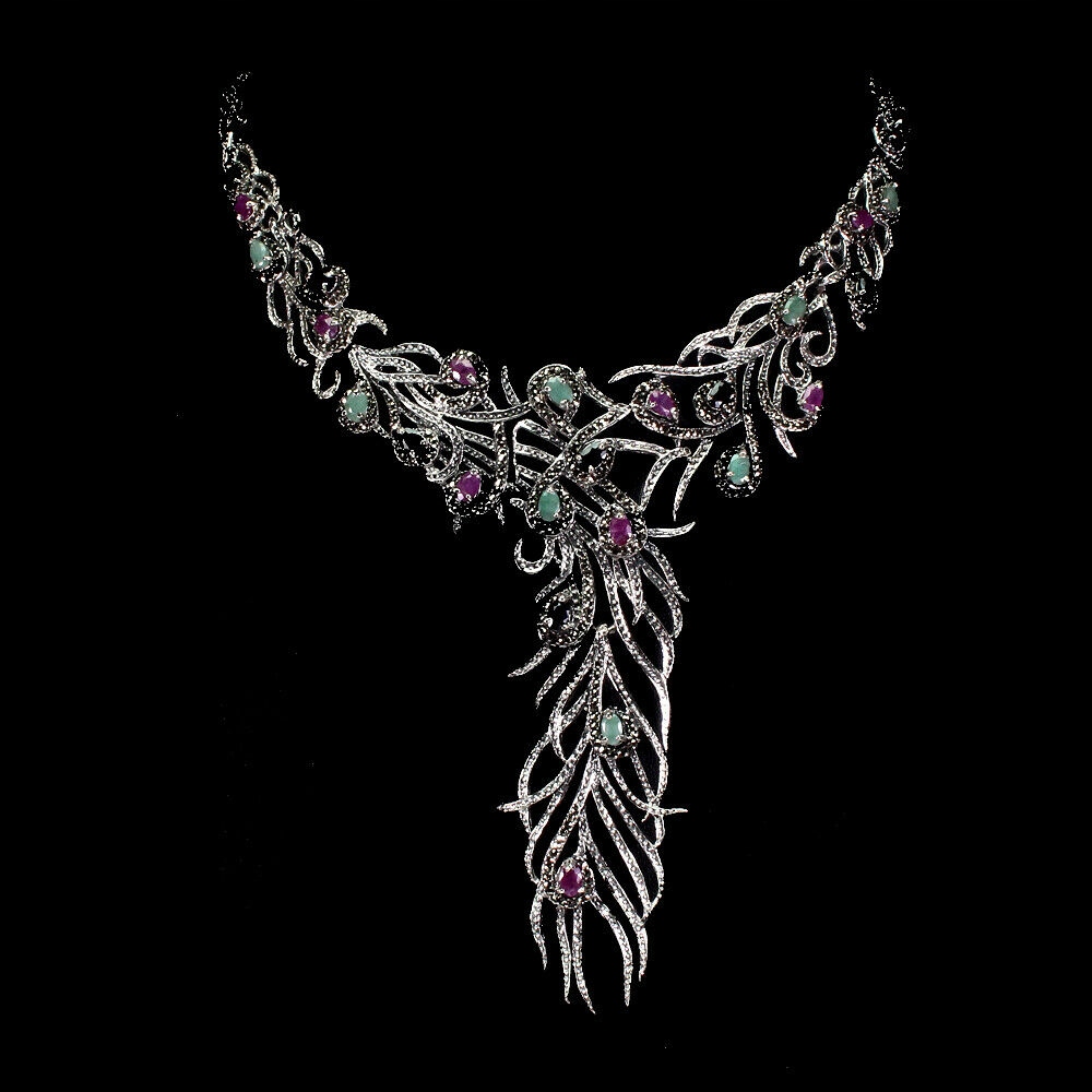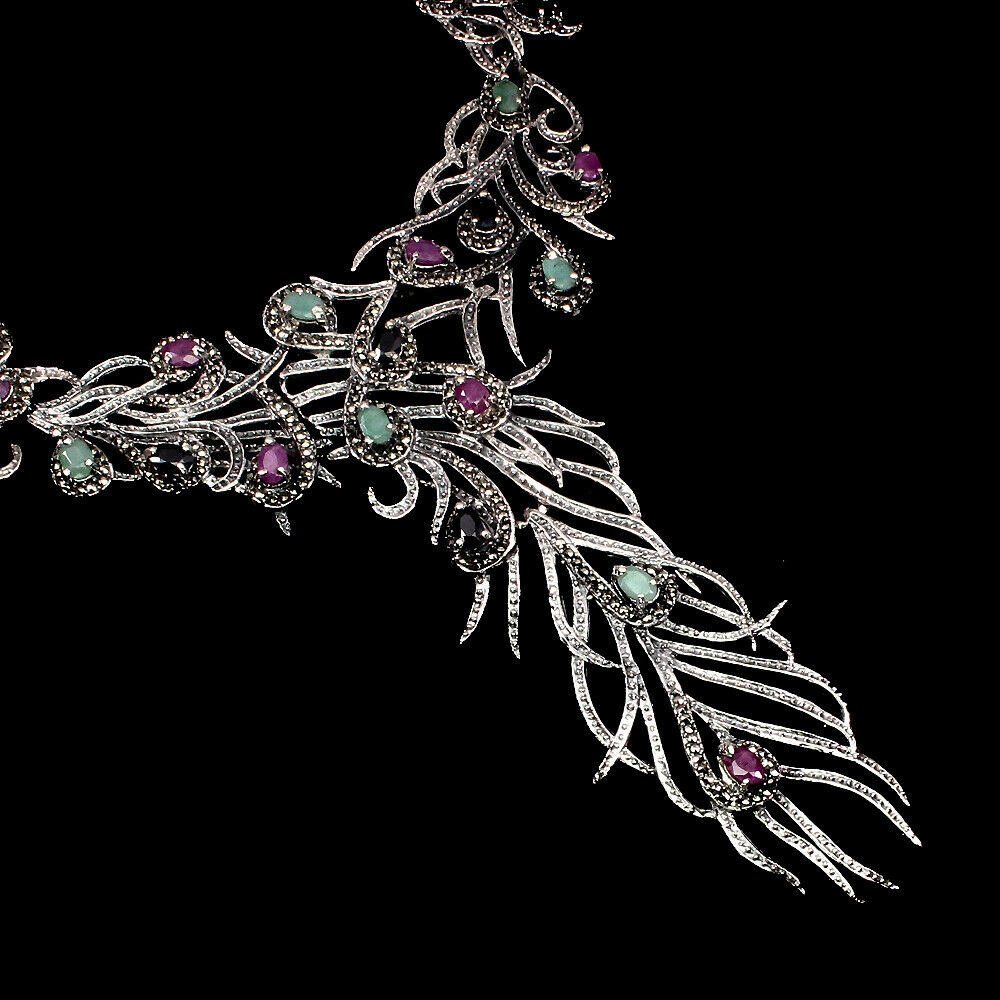 Ich biete eine neue (ohne Etikett) Halskette aus Silber - 925 mit natürlichen Smaragden, Markasiten, Rubinen und Saphiren zum Verkauf an.