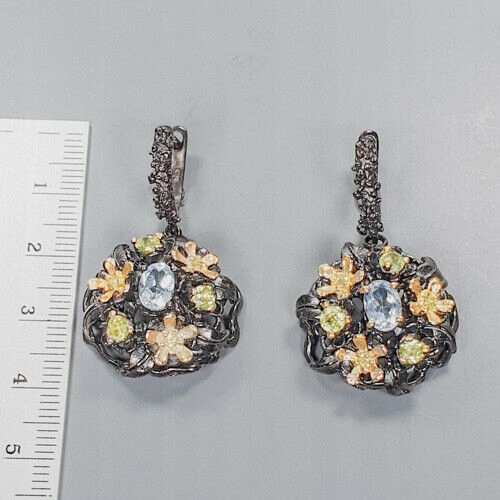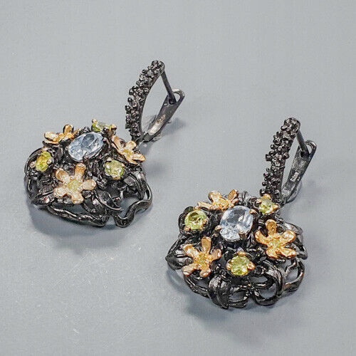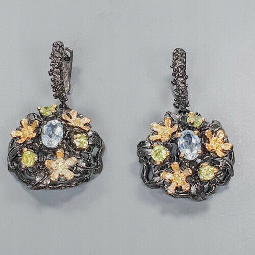 Wir bieten Ihnen neue, gelbgoldene und schwarzrhodinierte Ohrringe aus 925er Silber mit natürlichen Peridots und blauem Topas.