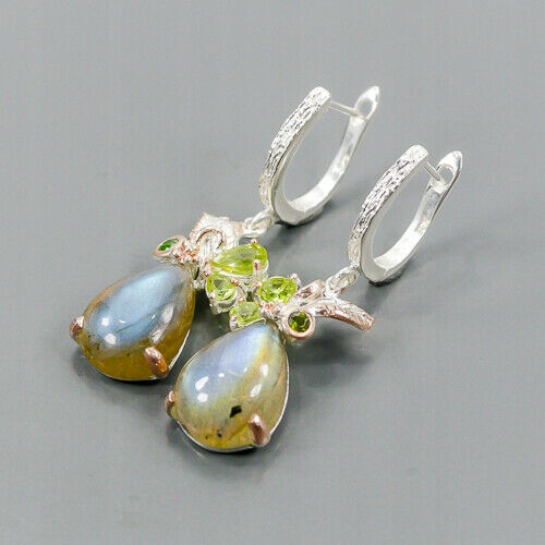Wir bieten Ihnen neue, weiß- und rosévergoldete Ohrringe aus Silber - 925 mit natürlichen Labradoriten, Olivinen und Diopsiden.