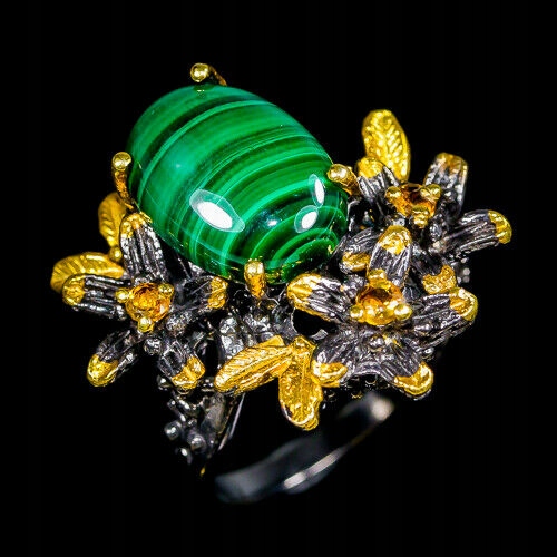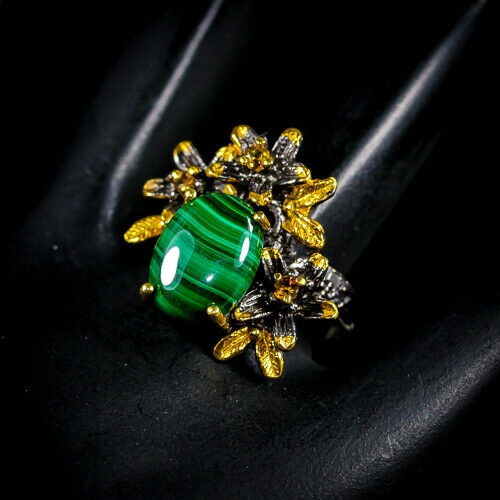 Wir bieten Ihnen einen neuen, gelbgoldenen und schwarzrhodinierten Silber-925-Ring mit natürlichen Turmalinen und Malachit an.