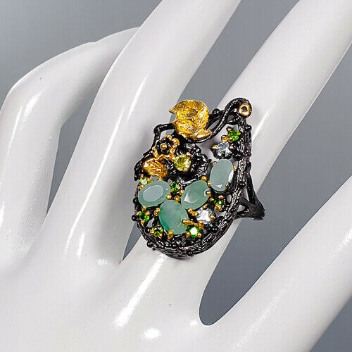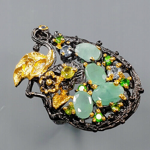 Wir bieten Ihnen einen neuen, Silber - 925 vergoldet mit Gelbgold und schwarz rhodinierten Ring mit natürlichen Smaragden, Diopsiden, Saphir, Topas und Olivin an.