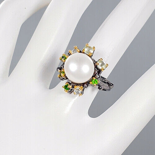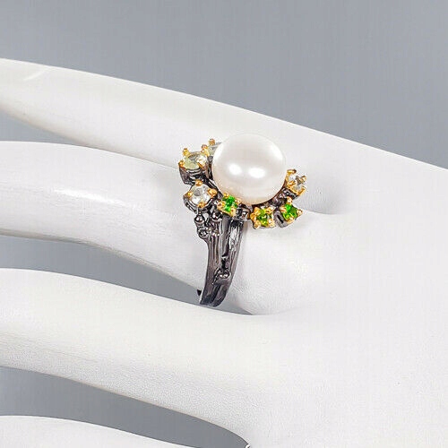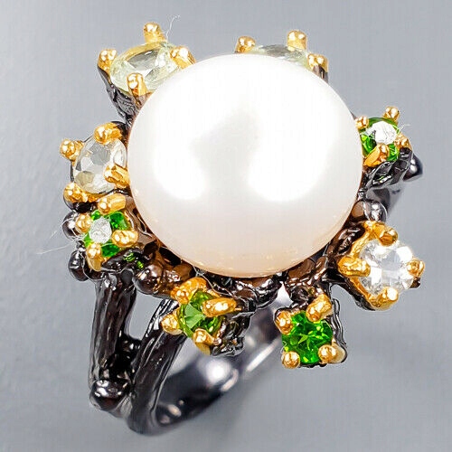 Wir bieten Ihnen einen neuen, gelbgoldenen und schwarzrhodinierten Silber - 925er Ring mit Naturperle, Diopsiden, Olivinen und Topas.