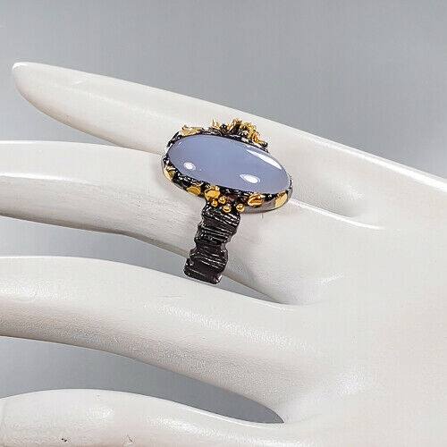 Wir bieten Ihnen einen neuen, gelbgoldenen und schwarzrhodinierten Silber-925-Ring mit natürlichem Chalcedon und Topas an.