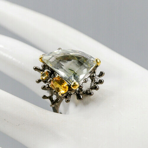 Wir bieten Ihnen einen neuen, gelbvergoldeten und schwarzrhodinierten Silberring - 925 mit natürlichem grünem Amethyst und Citrin.