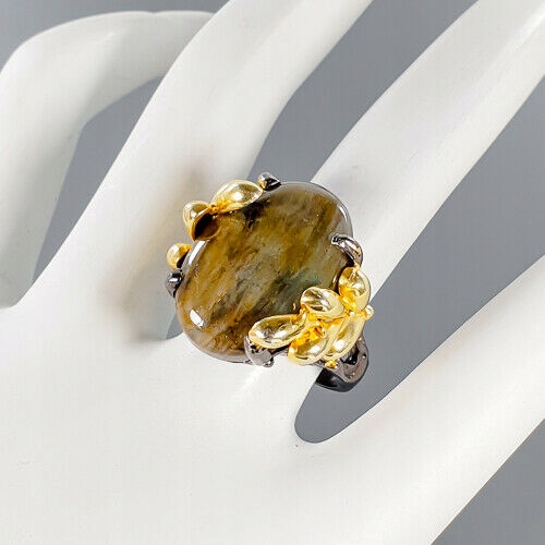 Wir bieten Ihnen einen neuen, gelbgoldenen und schwarzrhodinierten Silber - 925er Ring mit natürlichem Labradorit an.