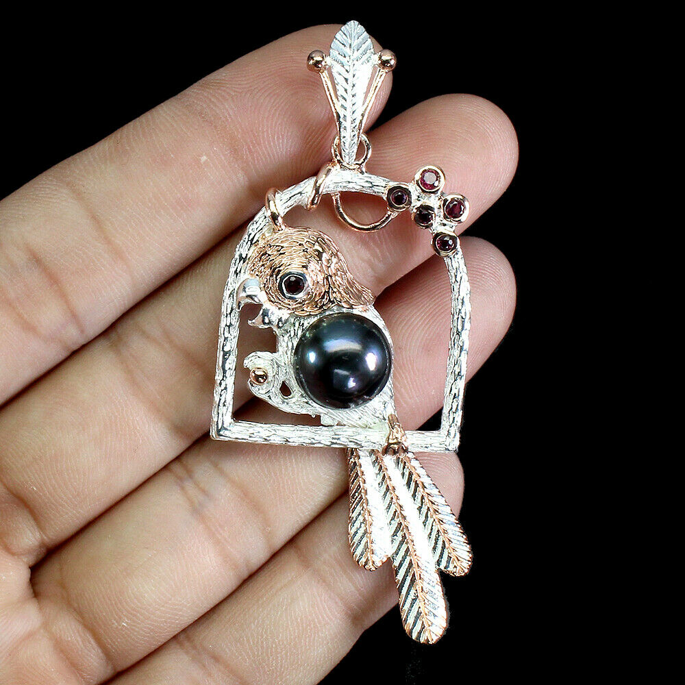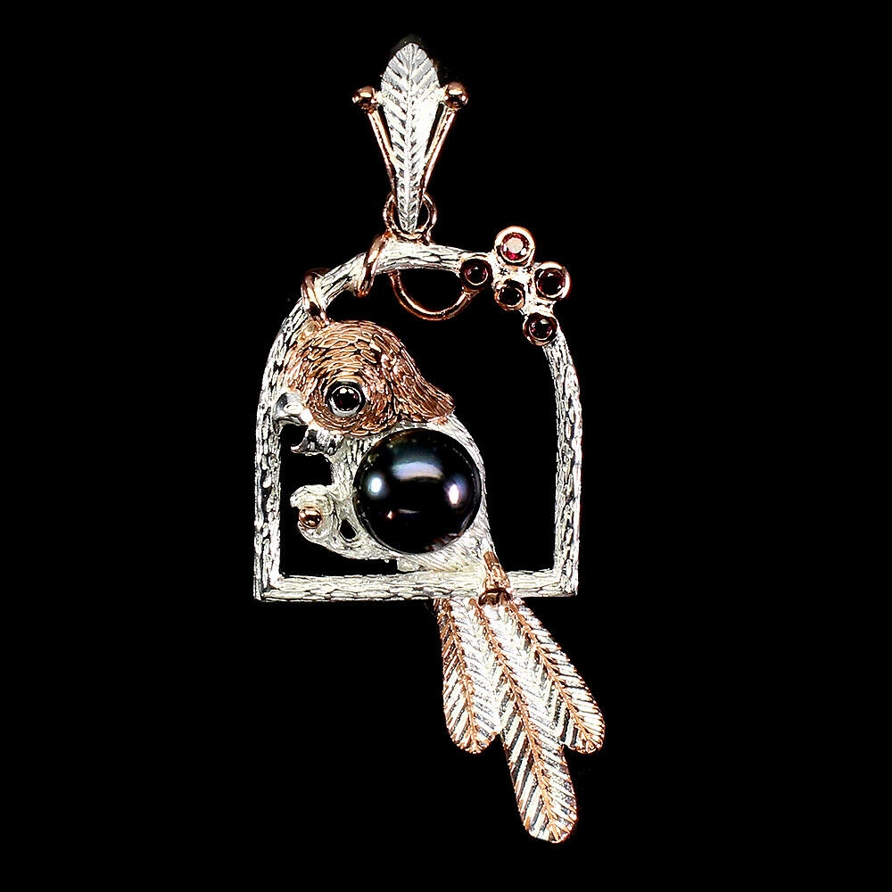 Kunstvoller Vogel Anhänger Granaten Black Perl 925