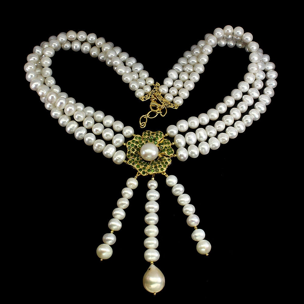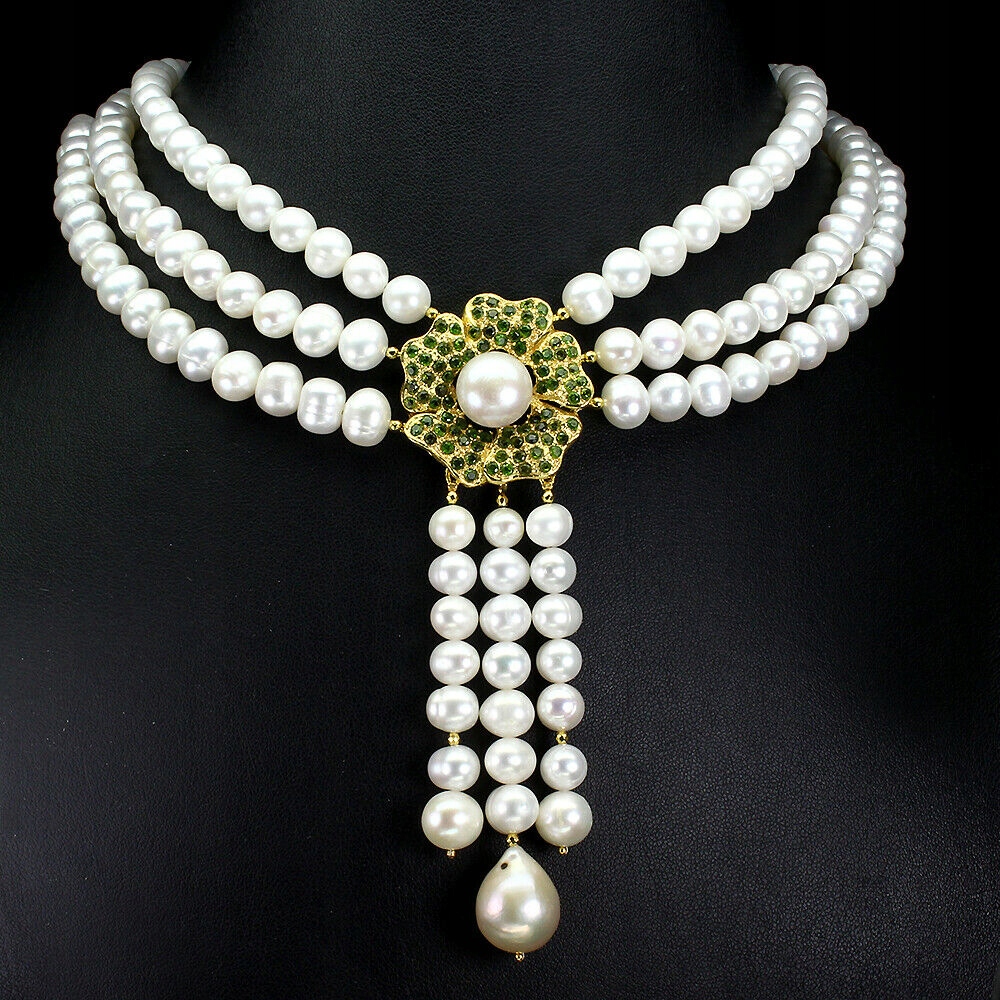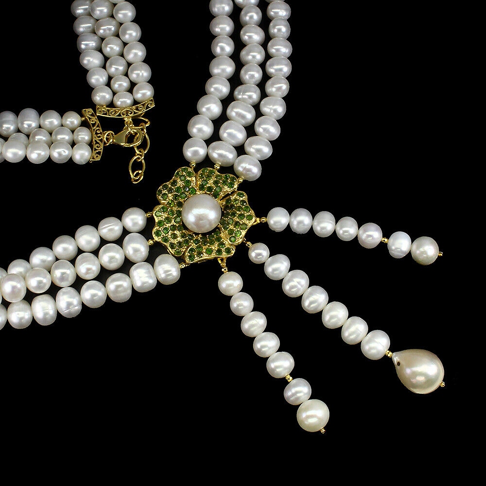 14 Karat gelbvergoldete Silber - 925er Silberkette mit Naturperlen und Diopsiden an.