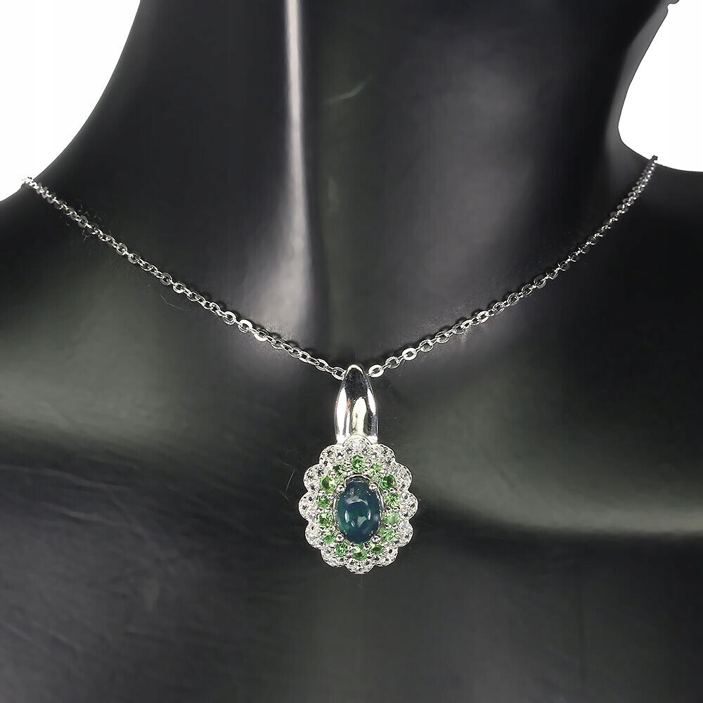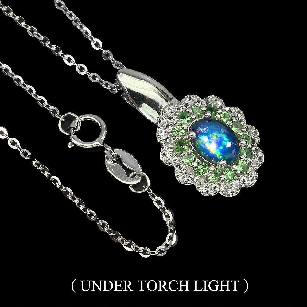 Wir bieten Ihnen eine neue, 14K weißvergoldete Silber-925-Halskette mit natürlichem schwarzem Opal, weißem Topas und Tsavorit (einer seltenen Granatart) an.
