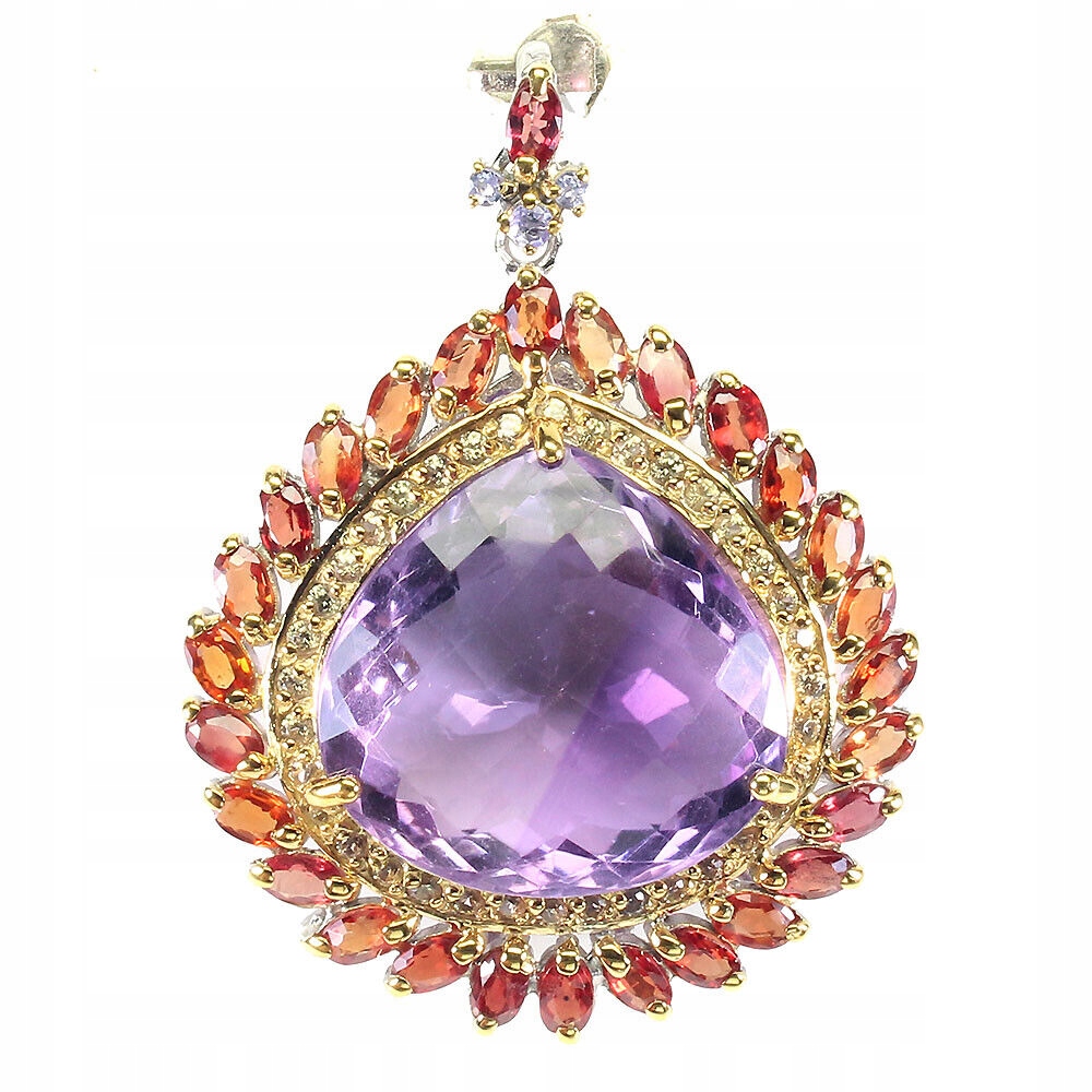 Wir bieten Ihnen einen neuen, mit Weiß- und Gelbgold plattierten 14K-Silber-925-Anhänger mit natürlichem 38,5-Karat-Amethyst, Saphiren und Tansaniten an.