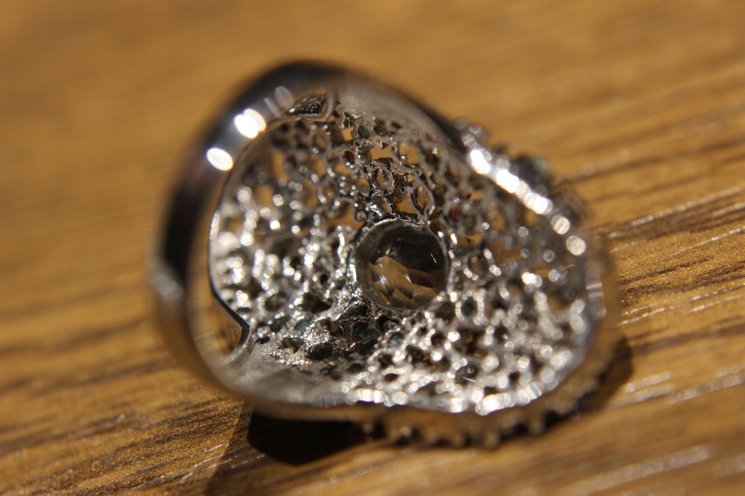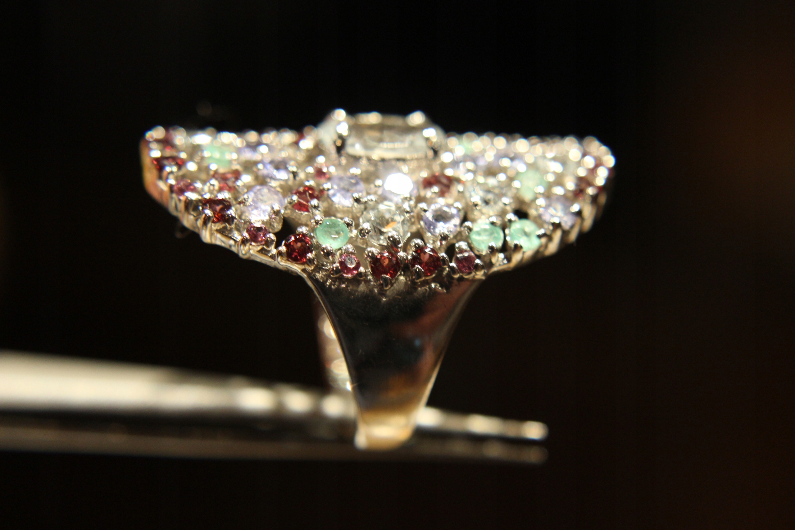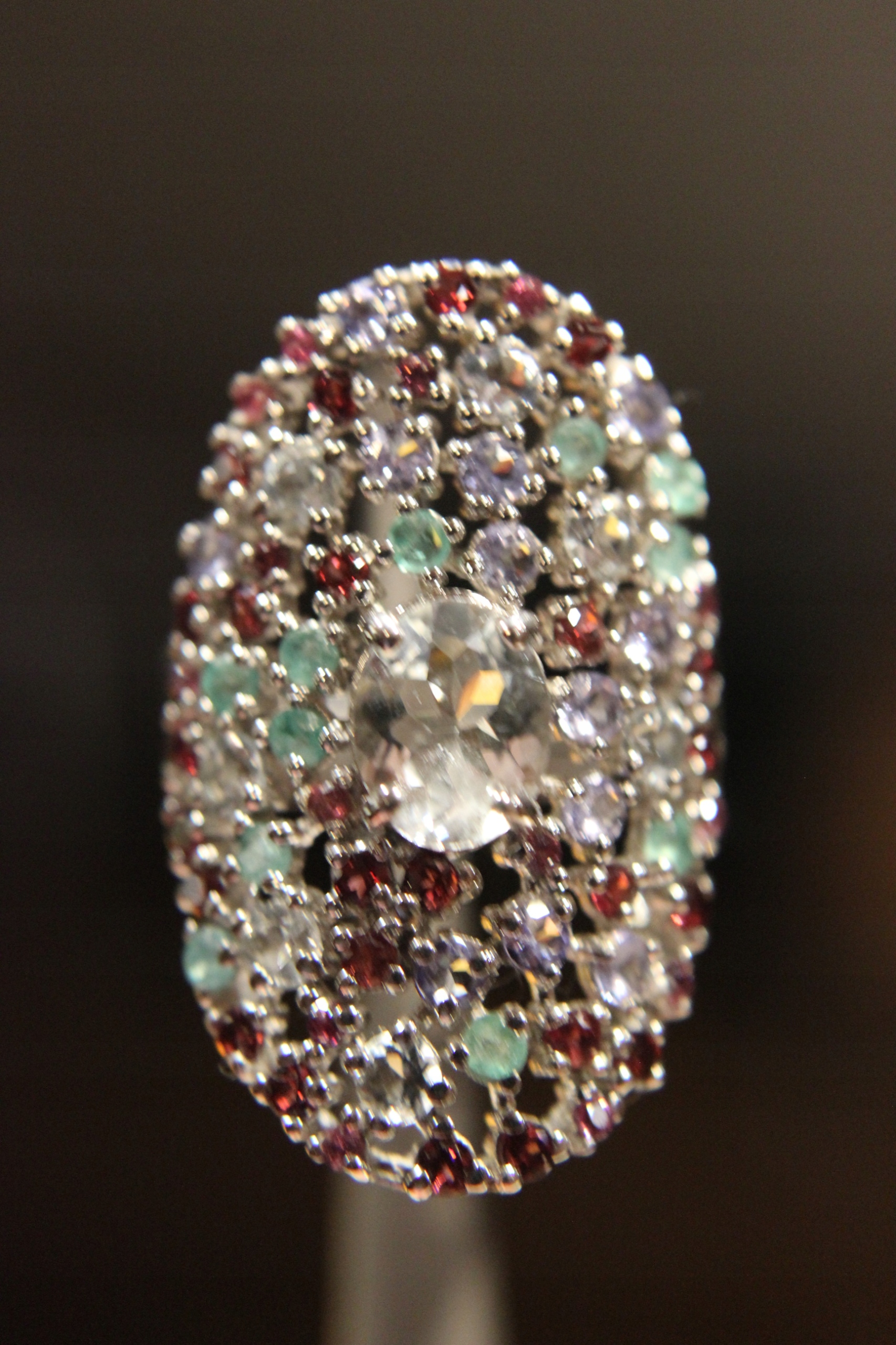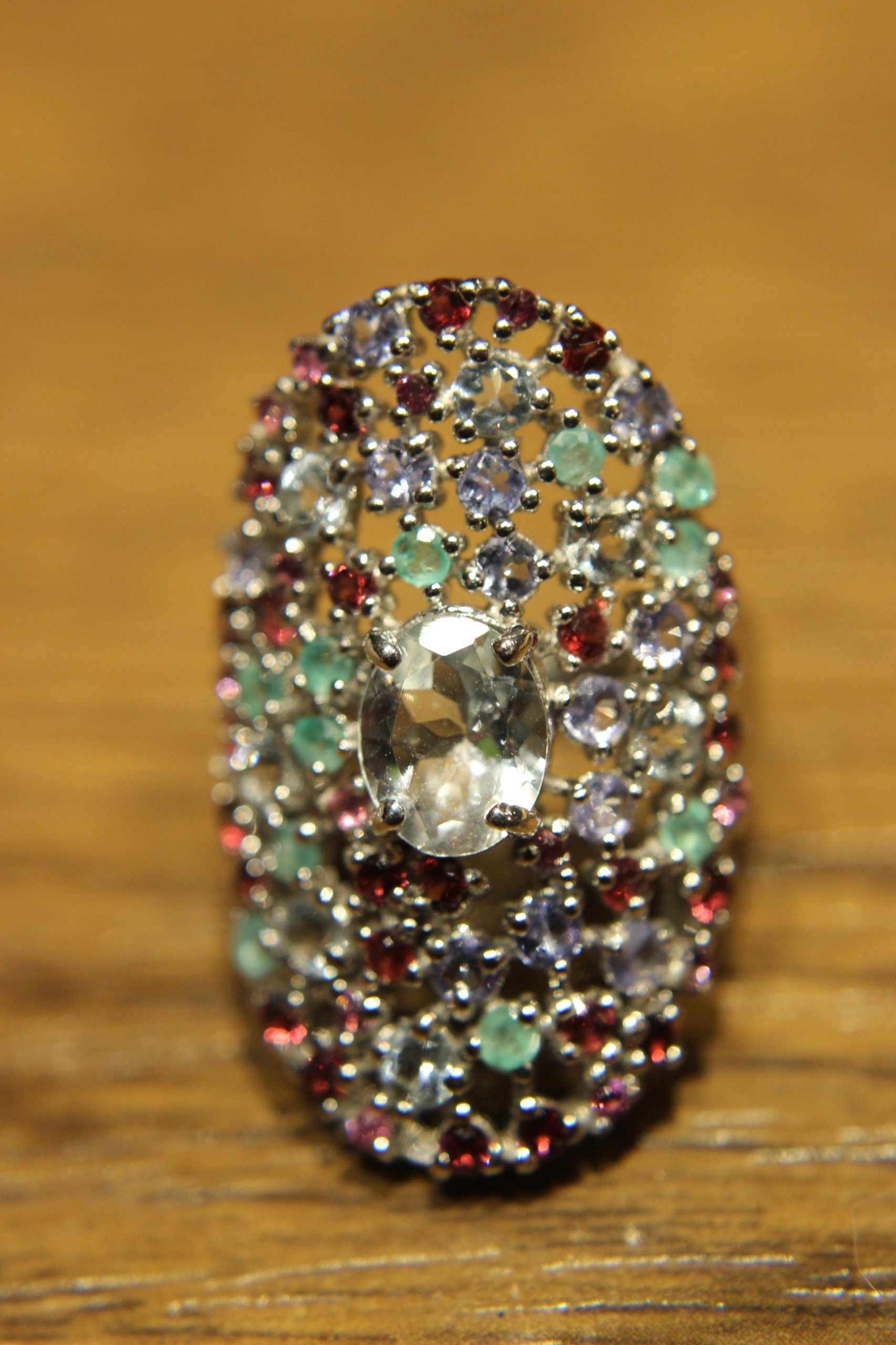 Silber - 925 - 14K weißvergoldeter Ring mit natürlichen Aquamarinen, Tansaniten, Granat und Smaragden an.