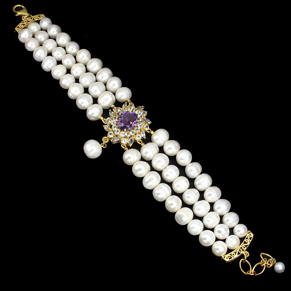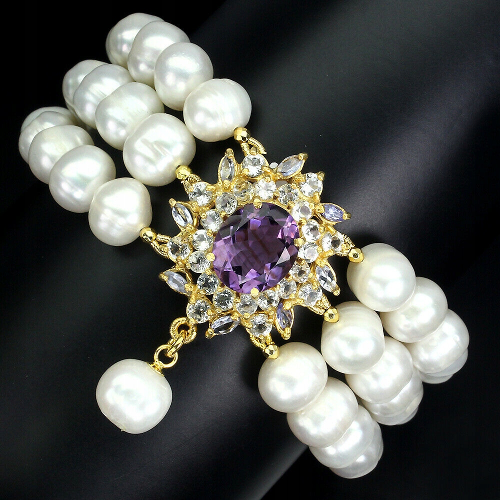 Wir bieten Ihnen ein neues Armband aus 14 Karat Gelbgold, Silber - 925 mit natürlichem Amethyst, Tansaniten, weißem Topas und Perlen an.