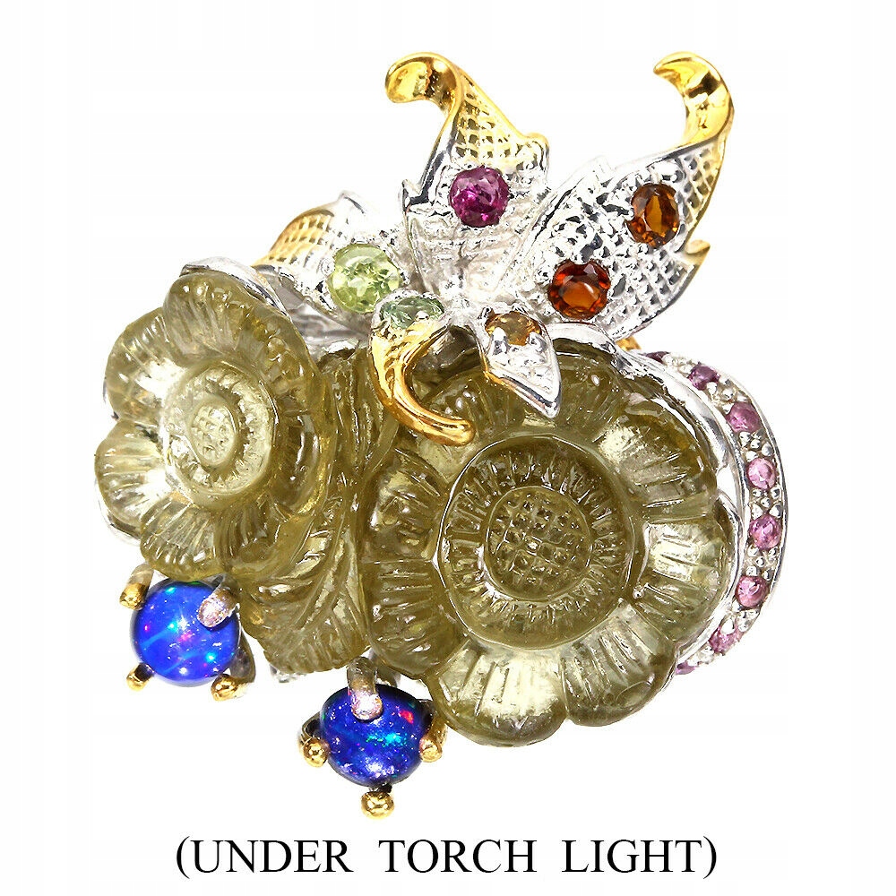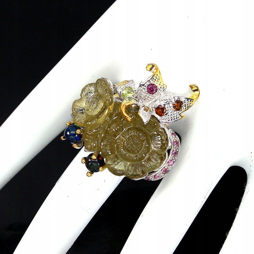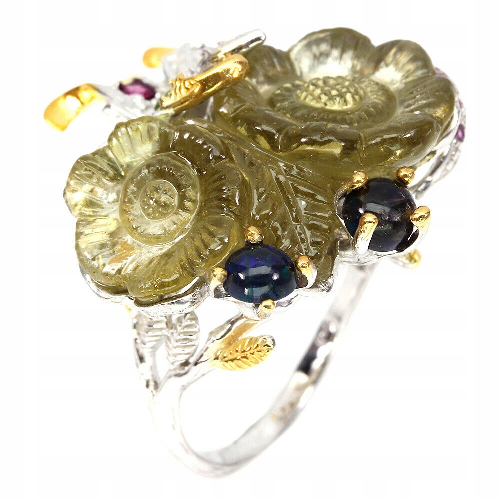 14K Gelb- und Weißgold Silber - 925 Ring mit natürlichem Zitronenquarz, geschnitzter Blume, Opal, Granat (Rhodolithen) und Turmalinen.