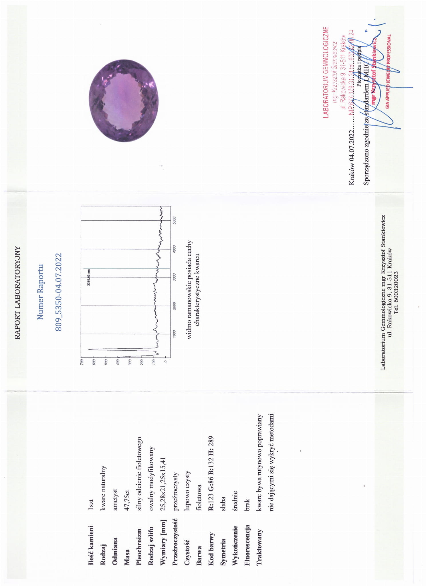 Schliff: Modifiziertes Oval, Sauberkeit: Lupe, Farbe: Lila. Die Parameter des Steins wurden im Laborbericht - Zertifikat beschrieben und sind auf dem beigefügten Foto dargestellt.