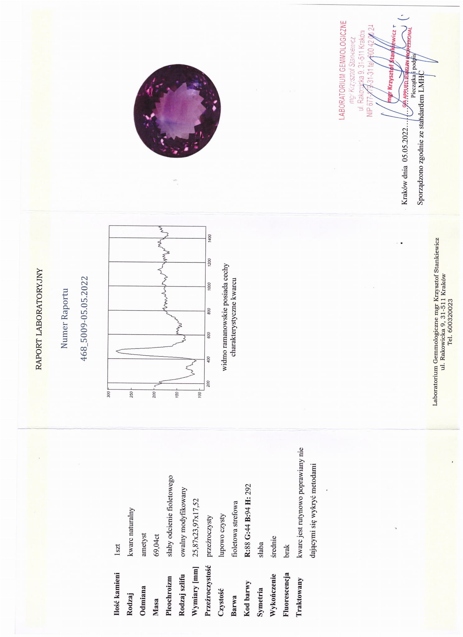 Amethyst Naturstein 69.04ct. Der Stein hat ein Zertifikat mit einer detaillierten Beschreibung seiner Parameter und einem Wert von 4.700 PLN.