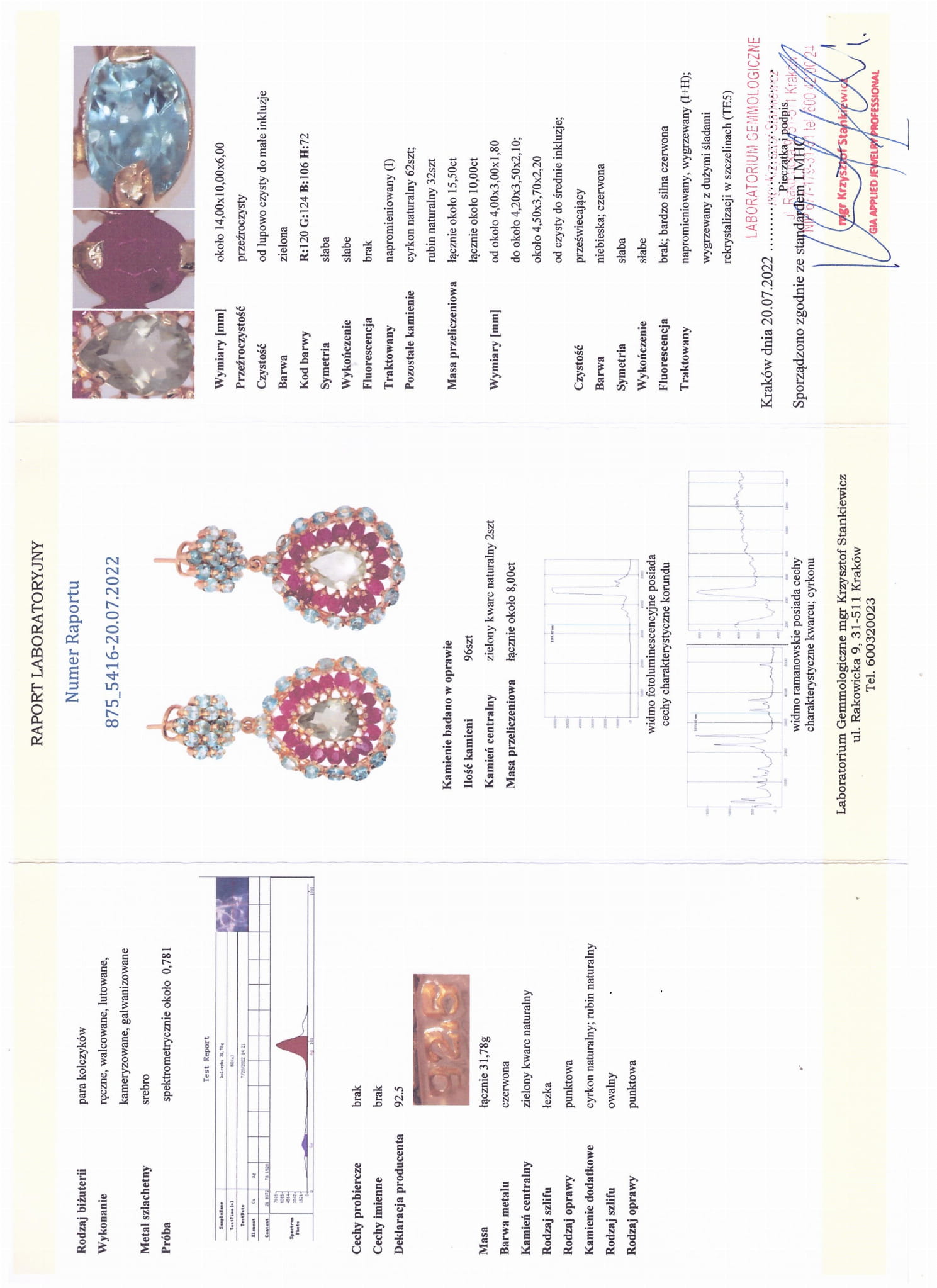 Anzahl Steine: 96 Stk. Mittelstein: grüner Naturquarz 2 Stk., ca. 8,00 ct. Weitere Steine: Naturzirkon 62 Stk., ca. 15,50 ct, Naturrubin 32 Stk., ca. 10,00 ct. Eine genaue Beschreibung der Steine finden Sie im Laborbericht - das auf dem Foto sichtbare Zertifikat.