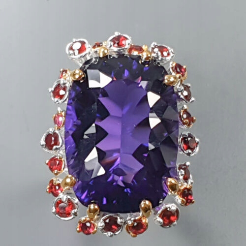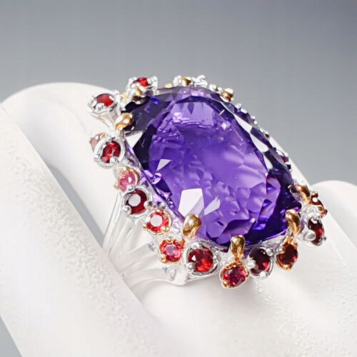 wir bieten Ihnen einen neuen, gelb- und weißvergoldeten Silber - Feinheit 925 (spektrometrisch ca. 0,833) Ring mit natürlichem 40.00ct Amethyst und Rhodoliten. Es hat ein Zertifikat und eine Schätzung für 3.800 PLN. Es ist: gegossen, gelötet, kameraisiert, verzinkt.