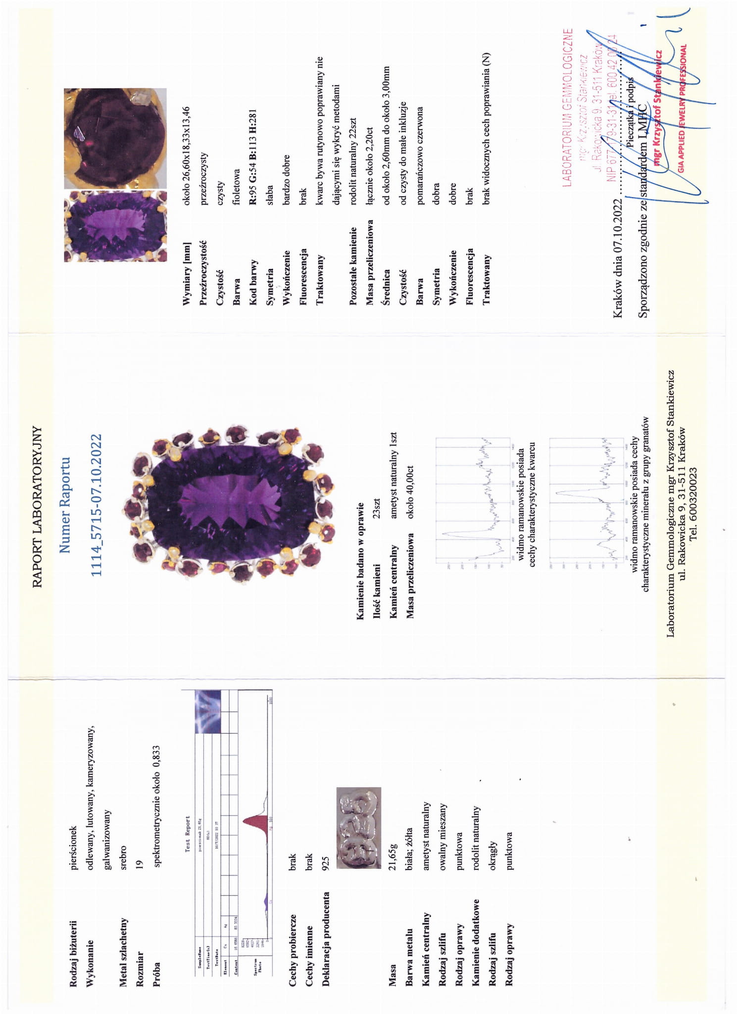 Anzahl Steine: 23 Stk. Mittelstein: natürlicher Amethyst 1 Stk., ca. 40.00ct. Andere Steine: natürlicher Rhodolith 22 Stk. Die genauen Parameter der Steine sind im Laborbericht dargestellt - Zertifikat auf dem präsentierten Foto sichtbar.