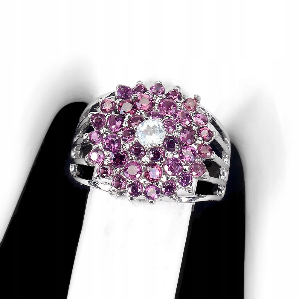 Wir bieten Ihnen einen neuen, 14K Weißgold vergoldeten 925er Silberring mit natürlichem Aquamarin und Granaten (Rhodolithen) an.