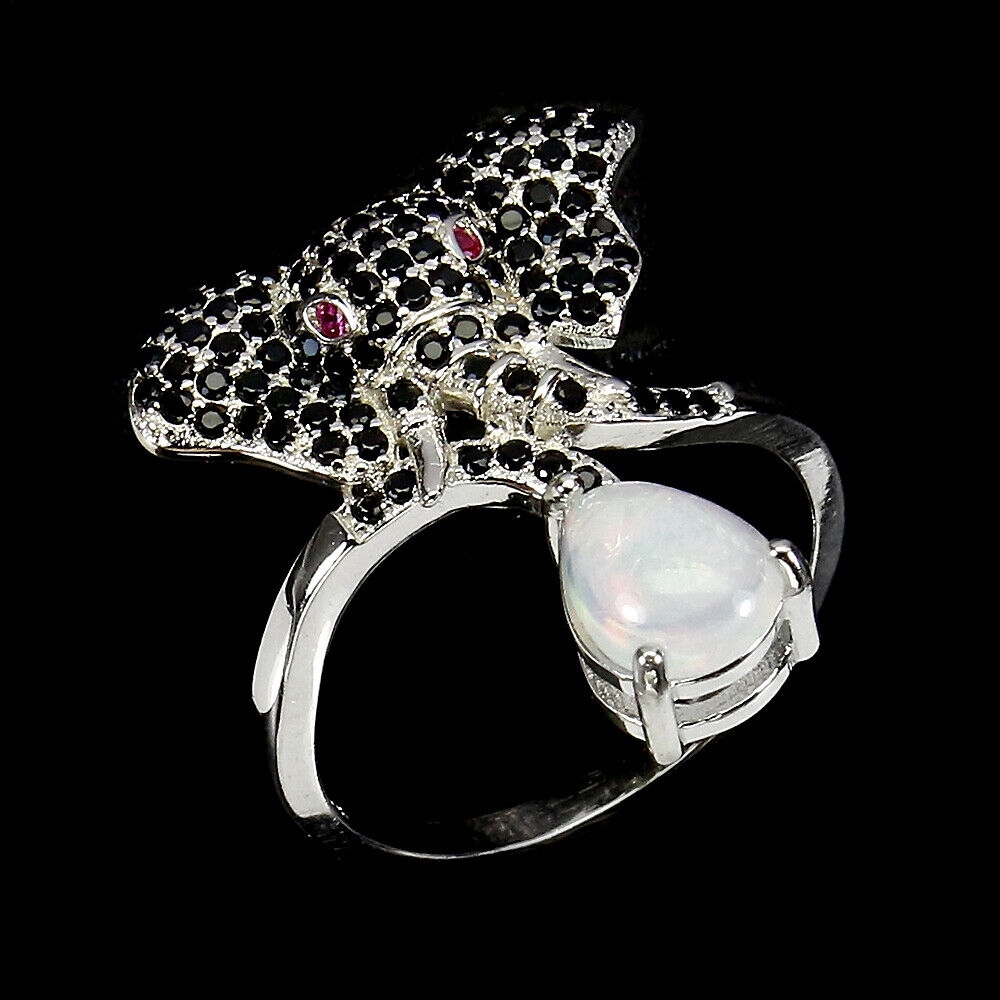 Wir bieten Ihnen einen neuen, 14K weißvergoldeten Silberring - 925 mit natürlichem Feueropal und schwarzen Spinellen und Zirkonias.