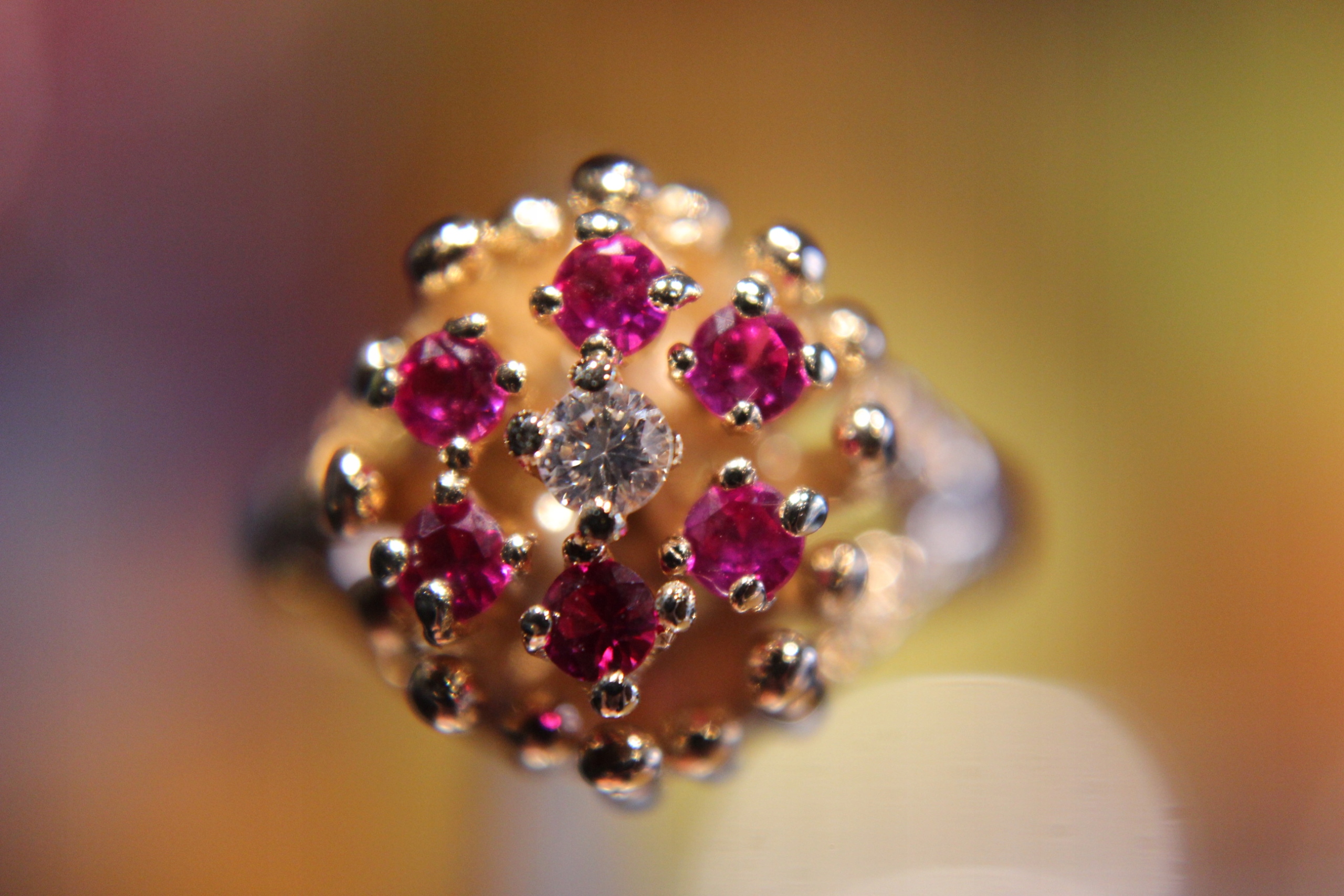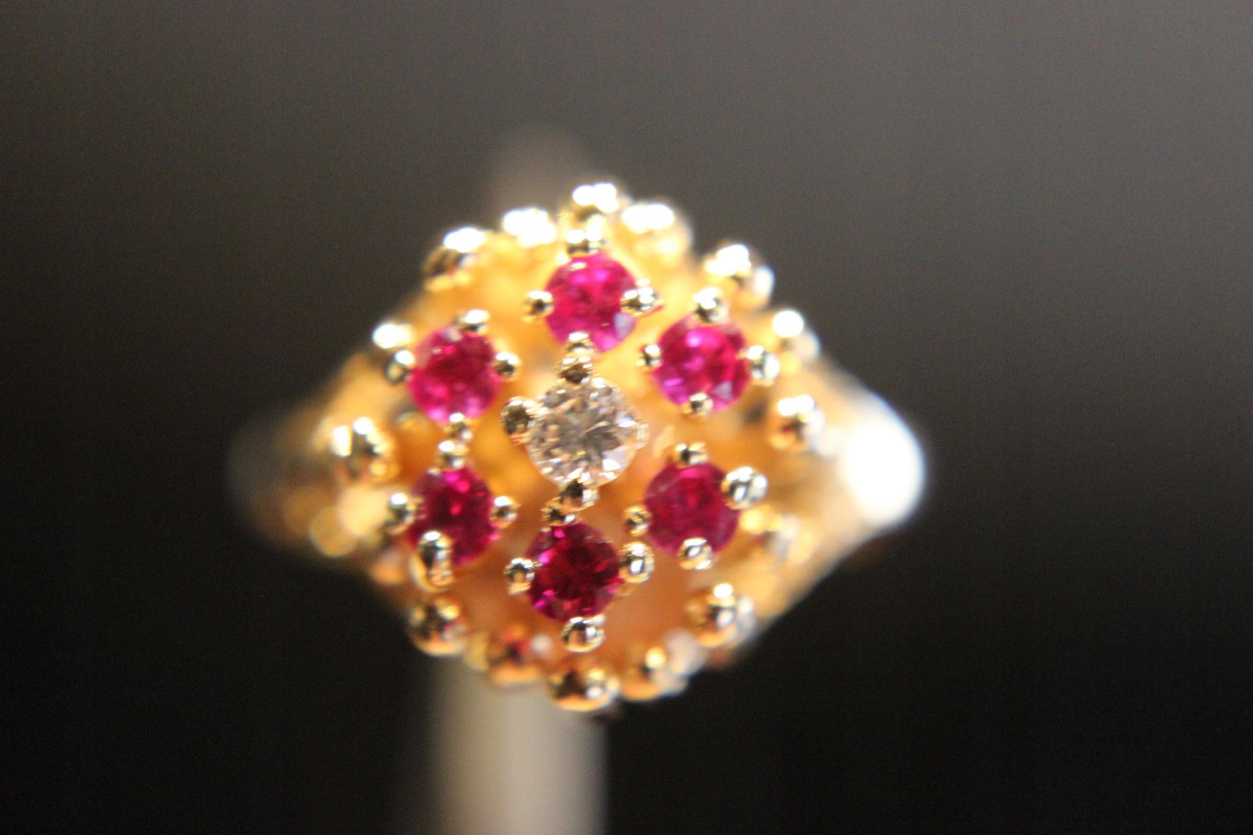 wir bieten einen neuen, spektrometrischen Goldring mit einem Feingehalt von ca. 0,582 (Herstellerangabe 14 Karat) mit natürlichen Diamanten und synthetischen Rubinen an.
