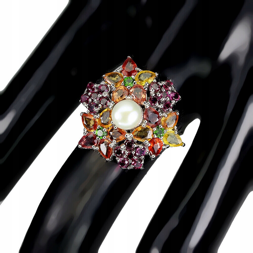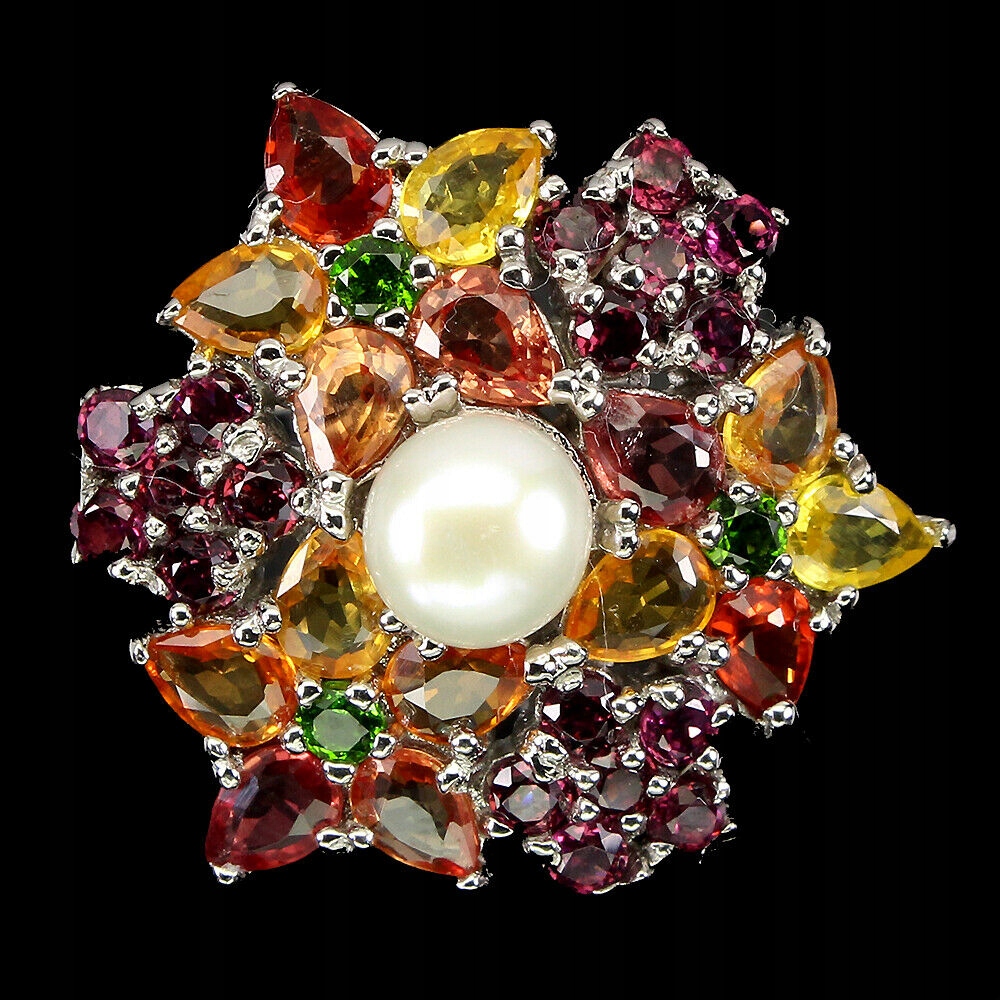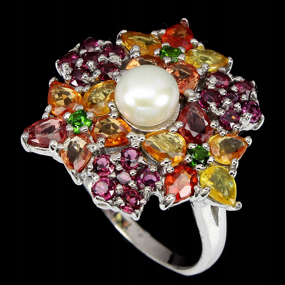14K weiß vergoldeten Silber - 925 Musterring mit Naturperle, Songea Padparadja Saphiren, Diopsiden und Granat (Rhodolith) zum Verkauf.