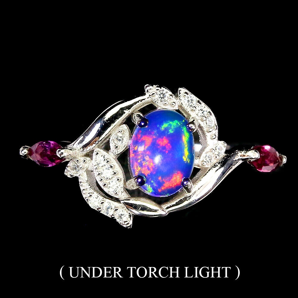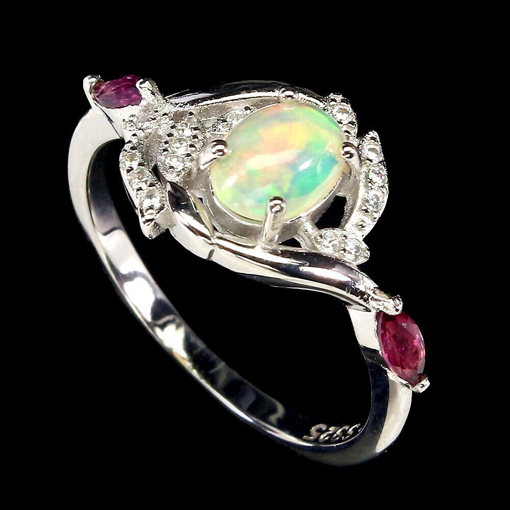 Wir bieten Ihnen einen neuen, vergoldeten 14 Karat Weißgold, Silber - 925er Feinheitsring mit natürlichem Feueropal und Granaten (Rhodoliten) und Zirkonias.