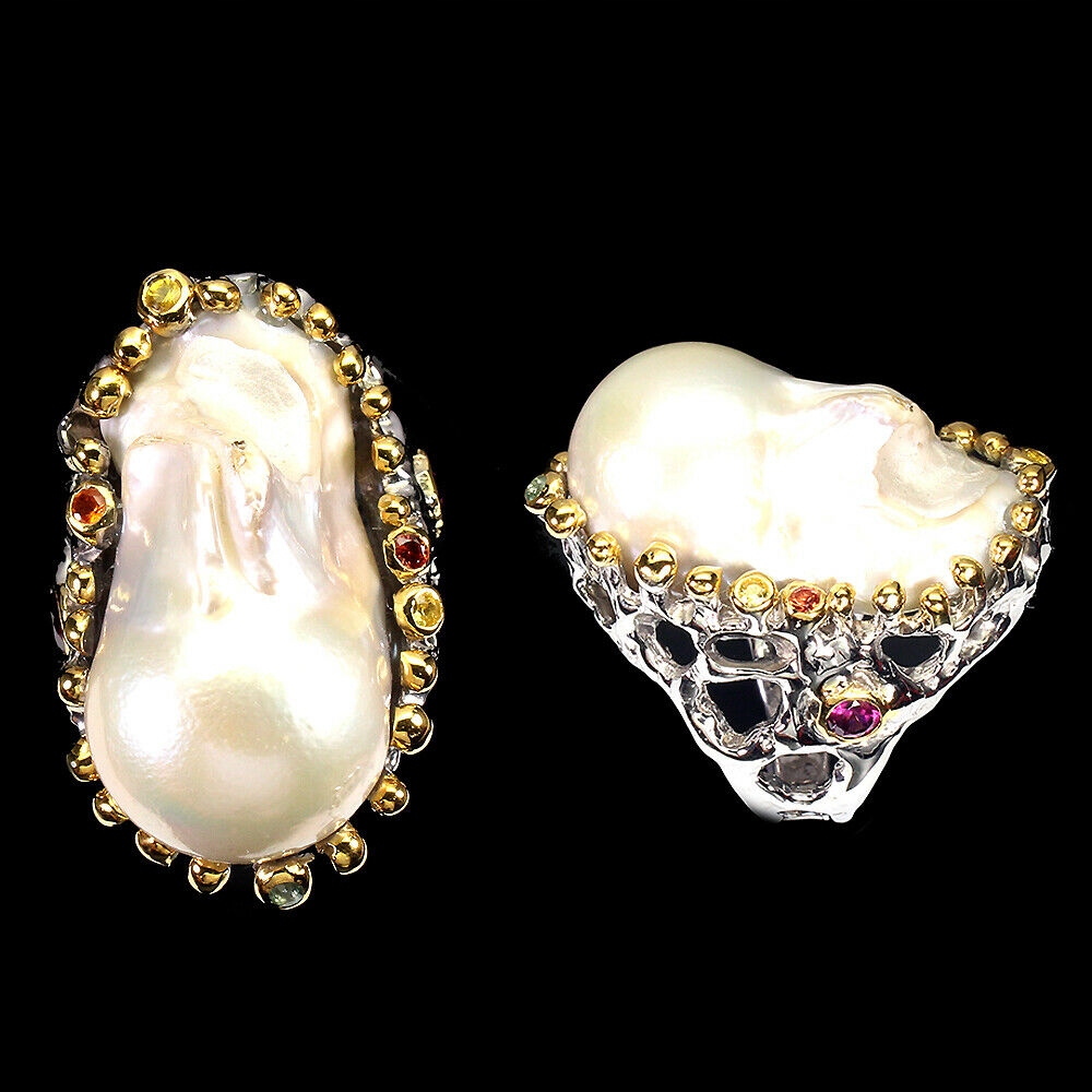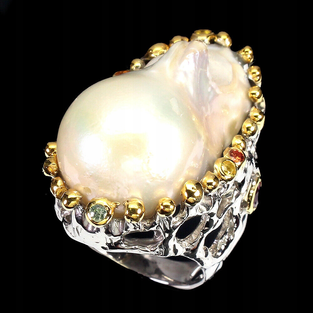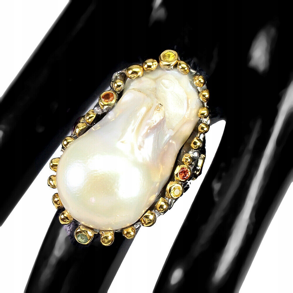 Wir bieten Ihnen einen neuen, weißen und gelben Ring aus 14 Karat Gold, Silber - 925 mit einer natürlichen Barockperle, Songea-Saphiren und Granaten (Rhodolithen).