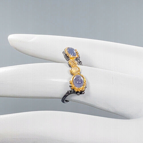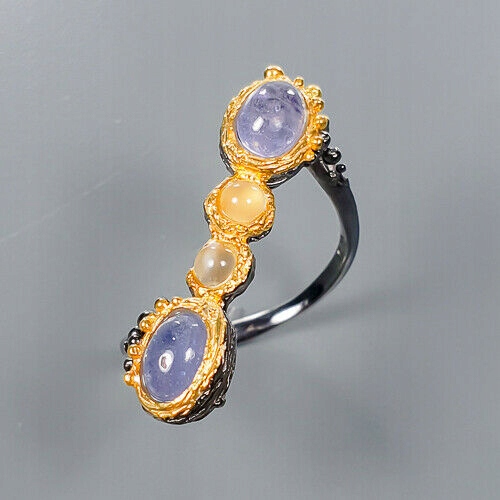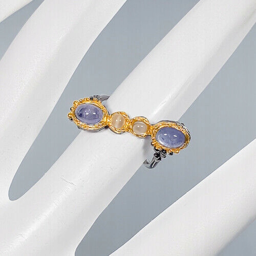 Wir bieten Ihnen einen neuen, gelbgoldenen und schwarzrhodinierten Silber-925-Ring mit natürlichen Mondsteinen und Tansaniten an.
